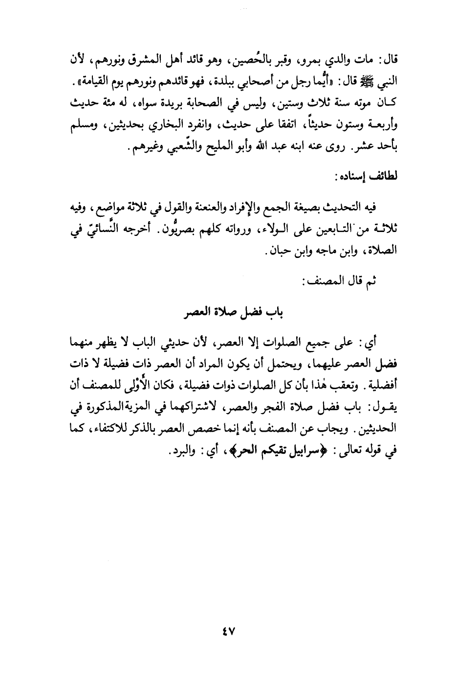 فيه التحديث بصيغة الجمع والإفراد والعنعنة والقول في ثلاثة مواضع، وفيه ثلاثة من التابعين على الولاء، ورواته كلهم بصريُّون. أخرجه النَّسائيّ في الصلاة، وابن ماجه وابن حبان.