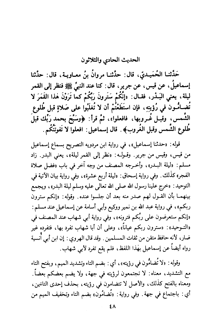 حَدَّثَنَا الْحُمَيْدِيُّ، قَالَ: حَدَّثَنَا مَرْوَانُ بْنُ مُعَاوِيَةَ قَالَ: حَدَّثَنَا إِسْمَاعِيلُ، عَنْ قَيْسٍ، عَنْ جَرِيرٍ، قَالَ كُنَّا عِنْدَ النَّبِيِّ -صلى الله عليه وسلم- فَنَظَرَ إِلَى الْقَمَرِ لَيْلَةً، يَعْنِي الْبَدْرَ، فَقَالَ: "إِنَّكُمْ سَتَرَوْنَ رَبَّكُمْ كَمَا تَرَوْنَ هَذَا الْقَمَرَ لاَ تُضَامُّونَ فِي رُؤْيَتِهِ، فَإِنِ اسْتَطَعْتُمْ أَنْ لاَ تُغْلَبُوا عَلَى صَلاَةٍ قَبْلَ طُلُوعِ الشَّمْسِ وَقَبْلَ غُرُوبِهَا فَافْعَلُوا". ثُمَّ قَرَأَ {وَسَبِّحْ بِحَمْدِ رَبِّكَ قَبْلَ طُلُوعِ الشَّمْسِ وَقَبْلَ الْغُرُوبِ}. قَالَ إِسْمَاعِيلُ: افْعَلُوا لاَ تَفُوتَنَّكُمْ.