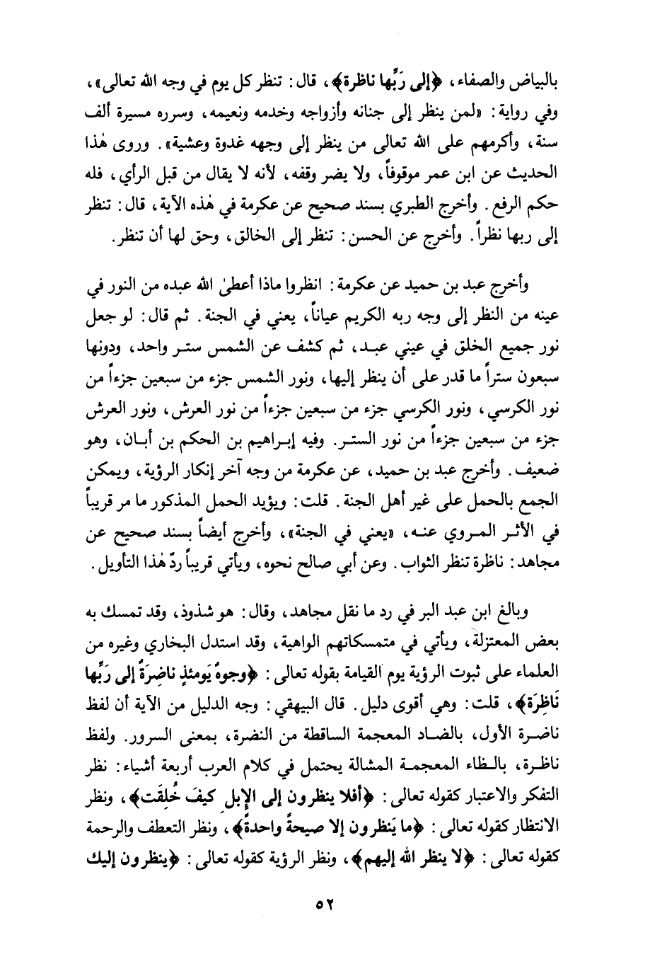 وبالغ ابن عبد البر في رد ما نقل مجاهد، وقال: هو شذوذ، وقد تمسك به بعض المعتزلة، ويأتي في متمسكاتهم الواهية، وقد استدل البخاري وغيره من العلماء على ثبوت الرؤية يوم القيامة بقوله تعالى: {وُجُوهٌ يَوْمَئِذٍ نَاضِرَةٌ إِلَى رَبِّهَا نَاظِرَةٌ}، قلت: وهي أقوى دليل. قال البيهقي: وجه الدليل من الآية أن لفظ ناضرة الأول، بالضاد المعجمة الساقطة من النضرة، بمعنى السرور. ولفظ ناظرة، بالظاء المعجمة المشالة يحتمل في كلام العرب أربعة أشياء: نظر التفكر والاعتبار كقوله تعالى: {أَفَلَا يَنْظُرُونَ إِلَى الْإِبِلِ كَيْفَ خُلِقَتْ}، ونظر الانتظار كقوله تعالى: {مَا يَنْظُرُونَ إِلَّا صَيْحَةً وَاحِدَةً}، ونظر التعطف والرحمة كقوله تعالى: {لا ينظر الله إليهم}، ونظر الرؤية كقوله تعالى: {يَنْظُرُونَ إِلَيْكَ