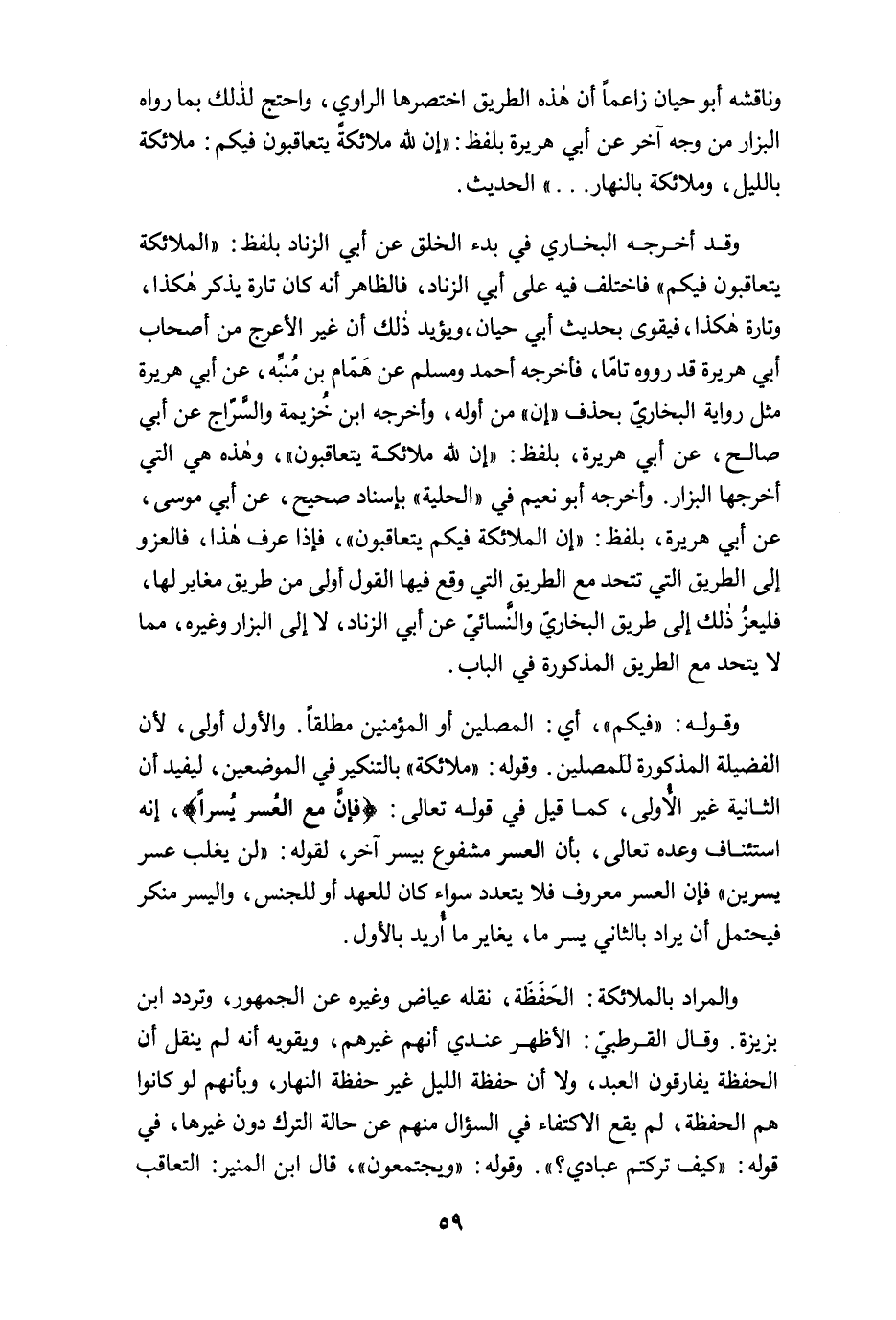 وناقشه أبو حيان زاعمًا أن هذه الطريق اختصرها الراوي، واحتج لذلك بما رواه البزار من وجه آخر عن أبي هريرة بلفظ: "إن لله ملائكةً يتعاقبون فيكم: ملائكة بالليل، وملائكة بالنهار ... " الحديث.