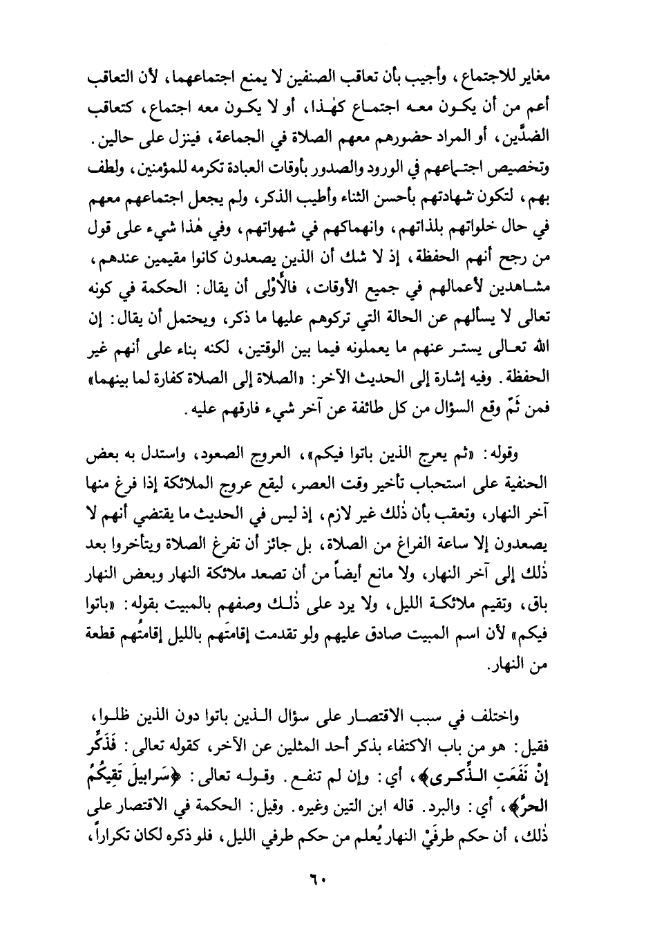 مغاير للاجتماع، وأجيب بأن تعاقب الصنفين لا يمنع اجتماعهما، لأن التعاقب أعم من أن يكون معه اجتماع كهذا، أو لا يكون معه اجتماع، كتعاقب الضدَّين، أو المراد حضورهم معهم الصلاة في الجماعة، فينزل على حالين. وتخصيص اجتماعهم في الورود والصدور بأوقات العبادة تكرمه للمؤمنين، ولطف بهم، لتكون شهادتهم بأحسن الثناء وأطيب الذكر، ولم يجعل اجتماعهم معهم في حال خلواتهم بلذاتهم، وانهماكهم في شهواتهم، وفي هذا شيء على قول من رجح أنهم الحفظة، إذ لا شك أن الذين يصعدون كانوا مقيمين عندهم، مشاهدين لأعمالهم في جميع الأوقات، فالأَوْلى أن يقال: الحكمة في كونه تعالى لا يسألهم عن الحالة التي تركوهم عليها ما ذكر، ويحتمل أن يقال: إن الله تعالى يستر عنهم ما يعملونه فيما بين الوقتين، لكنه بناء على أنهم غير الحفظة. وفيه إشارة إلى الحديث الأخر: "الصلاة إلى الصلاة كفارة لما بينهما" فمن ثَمّ وقع السؤال من كل طائفة عن آخر شيء فارقهم عليه.