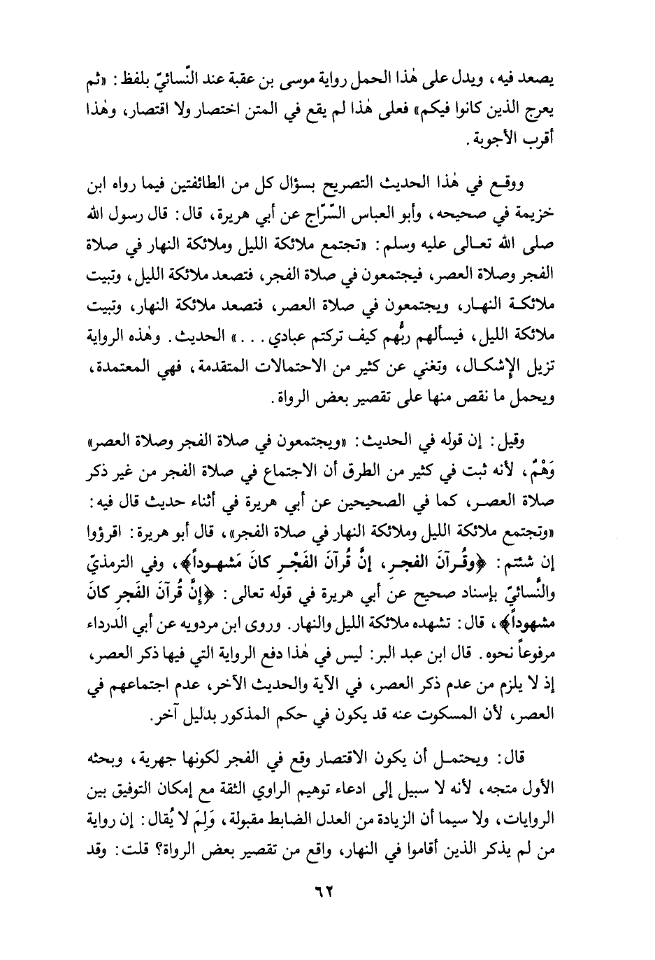 وقيل: إن قوله في الحديث: "ويجتمعون في صلاة الفجر وصلاة العصر" وَهْمٌ، لأنه ثبت في كثير من الطرق أن الاجتماع في صلاة الفجر من غير ذكر صلاة العصر، كما في الصحيحين عن أبي هريرة في أثناء حديث قال فيه: "وتجتمع ملائكة الليل وملائكة النهار في صلاة الفجر"، قال أبو هريرة: اقرؤوا إن شئتم {وَقُرْآنَ الْفَجْرِ إِنَّ قُرْآنَ الْفَجْرِ كَانَ مَشْهُودًا}، وفي الترمذيّ والنَّسائيّ بإسناد صحيح عن أبي هريرة في قوله تعالى {إِنَّ قُرْآنَ الْفَجْرِ كَانَ مَشْهُودًا}، قال: تشهده ملائكة الليل والنهار. وروى ابن مردويه عن أبي الدرداء مرفوعًا نحوه. قال ابن عبد البر: ليس في هذا دفع الرواية التي فيها ذكر العصر، إذ لا يلزم من عدم ذكر العصر، في الآية والحديث الآخر، عدم اجتماعهم في العصر، لأن المسكوت عنه قد يكون في حكم المذكور بدليل آخر.