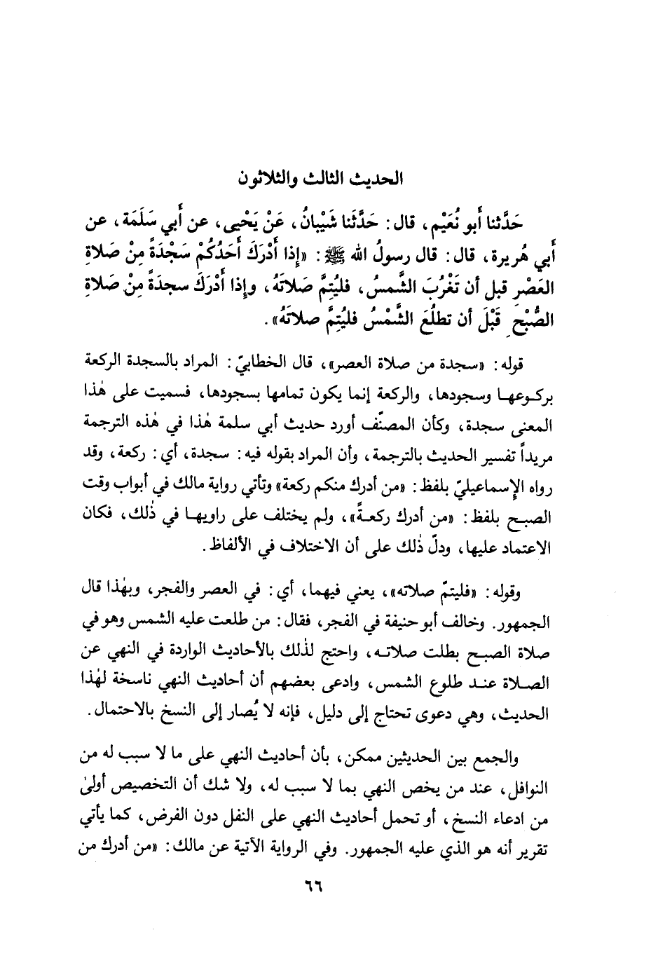 حَدَّثَنَا أَبُو نُعَيْمٍ، قَالَ: حَدَّثَنَا شَيْبَانُ، عَنْ يَحْيَى، عَنْ أَبِي سَلَمَةَ، عَنْ أَبِي هُرَيْرَةَ، قَالَ قَالَ رَسُولُ اللَّهِ -صلى الله عليه وسلم-: "إِذَا أَدْرَكَ أَحَدُكُمْ سَجْدَةً مِنْ صَلاَةِ الْعَصْرِ قَبْلَ أَنْ تَغْرُبَ الشَّمْسُ، فَلْيُتِمَّ صَلاَتَهُ، وَإِذَا أَدْرَكَ سَجْدَةً مِنْ صَلاَةِ الصُّبْحِ قَبْلَ أَنْ تَطْلُعَ الشَّمْسُ فَلْيُتِمَّ صَلاَتَهُ".