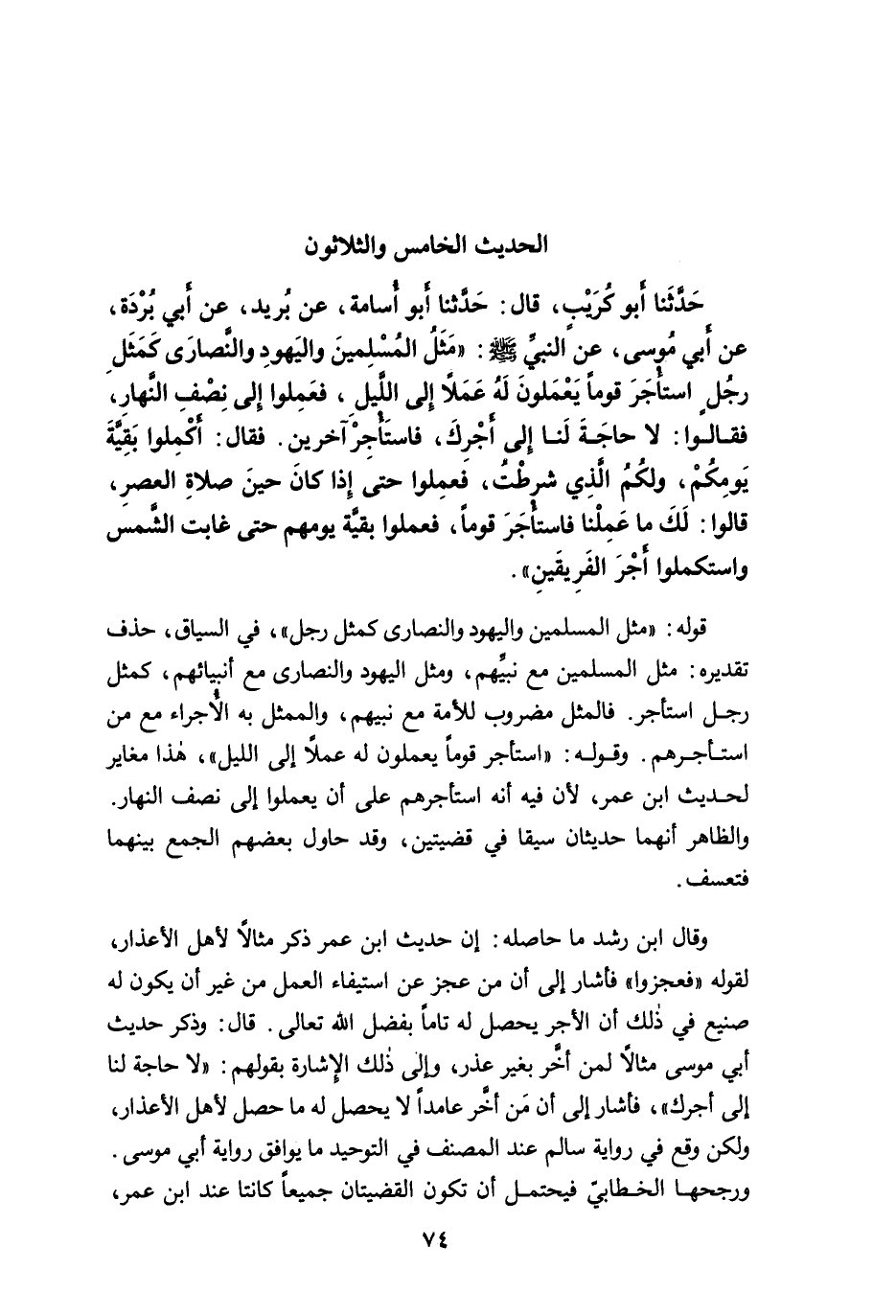حَدَّثَنَا أَبُو كُرَيْبٍ، قَالَ: حَدَّثَنَا أَبُو أُسَامَةَ، عَنْ بُرَيْدٍ، عَنْ أَبِي بُرْدَةَ، عَنْ أَبِي مُوسَى عَنِ النَّبِيِّ -صلى الله عليه وسلم-: "مَثَلُ الْمُسْلِمِينَ وَالْيَهُودِ وَالنَّصَارَى كَمَثَلِ رَجُلٍ اسْتَأْجَرَ قَوْمًا يَعْمَلُونَ لَهُ عَمَلاً إِلَى اللَّيْلِ، فَعَمِلُوا إِلَى نِصْفِ النَّهَارِ، فَقَالُوا: لاَ حَاجَةَ لَنَا إِلَى أَجْرِكَ، فَاسْتَأْجَرَ آخَرِينَ. فَقَالَ: أَكْمِلُوا بَقِيَّةَ يَوْمِكُمْ، وَلَكُمُ الَّذِى شَرَطْتُ، فَعَمِلُوا حَتَّى إِذَا كَانَ حِينَ صَلاَةِ الْعَصْرِ، قَالُوا: لَكَ مَا عَمِلْنَا. فَاسْتَأْجَرَ قَوْمًا، فَعَمِلُوا بَقِيَّةَ يَوْمِهِمْ حَتَّى غَابَتِ الشَّمْسُ، وَاسْتَكْمَلُوا أَجْرَ الْفَرِيقَيْنِ".