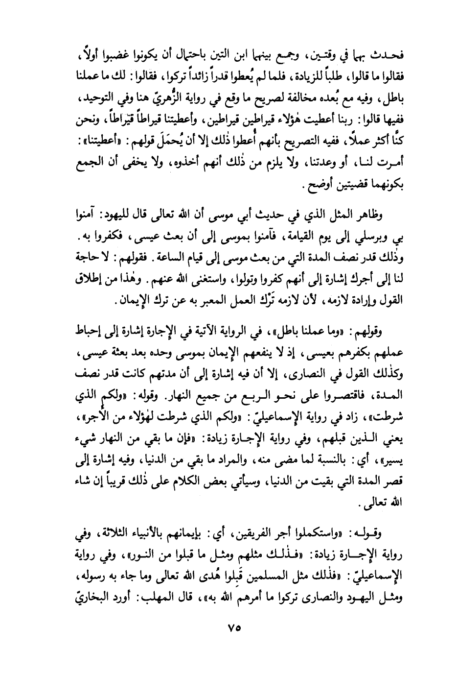 وظاهر المثل الذي في حديث أبي موسى أن الله تعالى قال لليهود: آمنوا بي وبرسلي إلى يوم القيامة، فآمنوا بموسى إلى أن بعث عيسى، فكفروا به. وذلك قدر نصف المدة التي من بعث موسى إلى قيام الساعة. فقولهم: لا حاجة لنا إلى أجرك إشارة إلى أنهم كفروا وتولوا، واستغنى الله عنهم. وهذا من إطلاق القول وإرادة لازمه، لأن لازمه تَرْك العمل المعبر به عن ترك الإيمان.