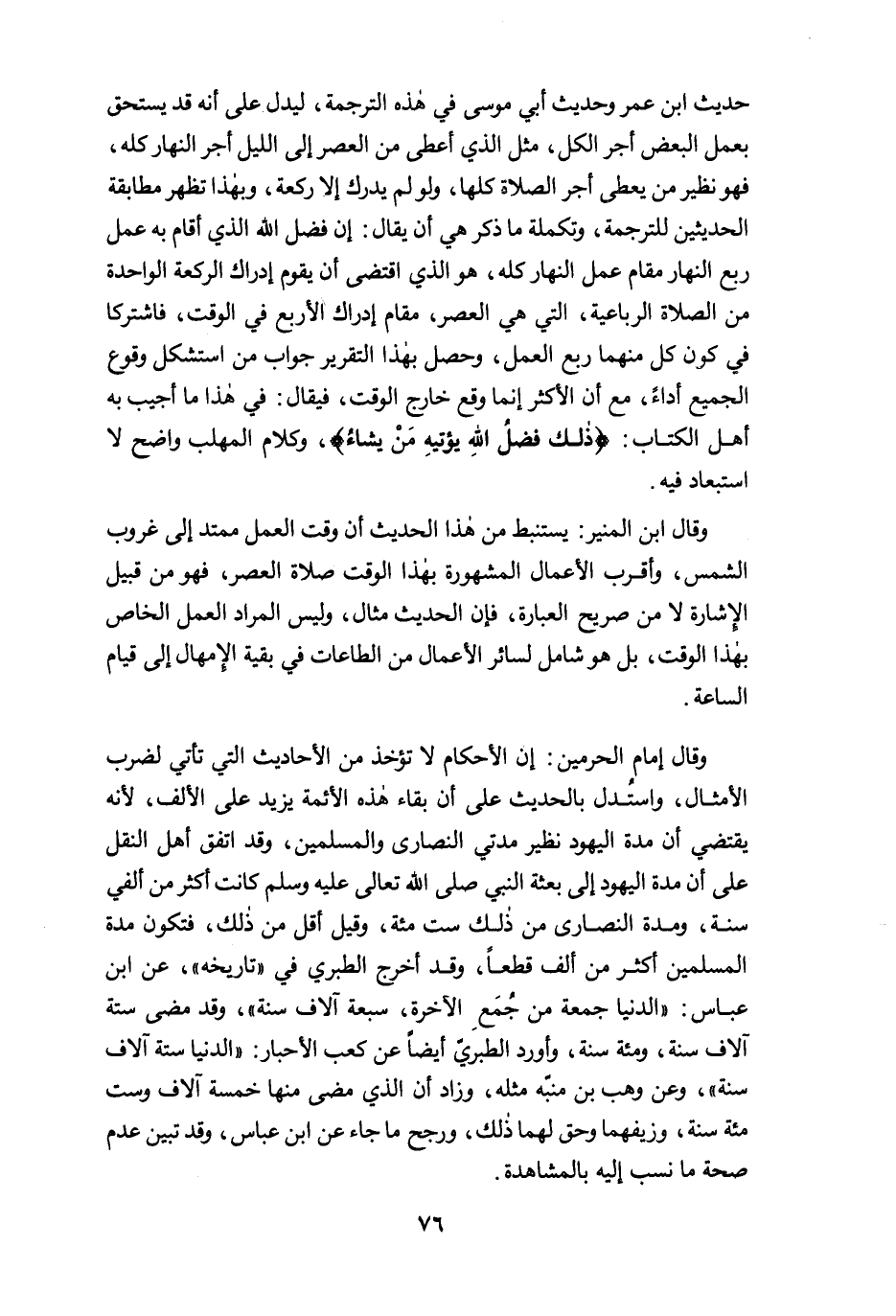 وقال إمام الحرمين: إن الأحكام لا تؤخذ من الأحاديث التي تأتي لضرب الأمثال، واستُدل بالحديث على أن بقاء هذه الأئمة يزيد على الألف، لأنه يقتضي أن مدة اليهود نظير مدتي النصارى والمسلمين، وقد اتفق أهل النقل على أن مدة اليهود الى بعثة النبي صلى الله تعالى عليه وسلم كانت أكثر من ألفي سنة، ومدة النصارى من ذلك ست مئة، وقيل أقل من ذلك، فتكون مدة المسلمين أكثر من ألف قطعًا، وقد أخرج الطبري في "تاريخه"، عن ابن عباس: "الدنيا جمعة من جُمَعِ الآخرة، سبعة آلاف سنة"، وقد مضى ستة آلاف سنة، ومئة سنة، وأورد الطبريّ أيضًا عن كعب الأحبار: "الدنيا ستة آلاف سنة"، وعن وهب بن منبّه مثله، وزاد أن الذي مضى منها خمسة آلاف وست مئة سنة، وزيفهما وحق لهما ذلك، ورجح ما جاء عن ابن عباس، وقد تبين عدم صحة ما نسب اليه بالمشاهدة.