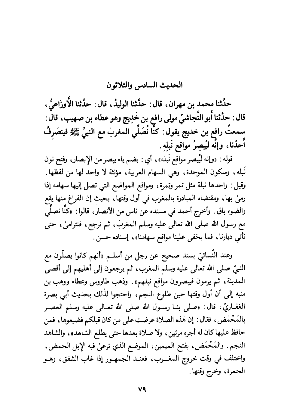 حَدَّثَنَا مُحَمَّدُ بْنُ مِهْرَانَ، قَالَ: حَدَّثَنَا الْوَلِيدُ، قَالَ: حَدَّثَنَا الأَوْزَاعِيُّ، قَالَ: حَدَّثَنَا أَبُو النَّجَاشِيِّ صُهَيْبٌ مَوْلَى رَافِعِ بْنِ خَدِيجٍ وهو عطاء بن صهيب، قَالَ: سَمِعْتُ رَافِعَ بْنَ خَدِيجٍ يَقُولُ: كُنَّا نُصَلِّي الْمَغْرِبَ مَعَ النَّبِيِّ -صلى الله عليه وسلم- فَيَنْصَرِفُ أَحَدُنَا وَإِنَّهُ لَيُبْصِرُ مَوَاقِعَ نَبْلِهِ.