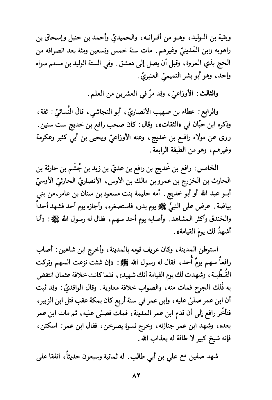 الخامس: رافع بن خَديج بن رافع بن عديّ بن زيد بن جُشَم بن حارثة بن الحارث بن الخزرج بن عمرو بن مالك بن الأوس، الأنصاريّ الحارثيّ الأوسيّ أبو عبد الله أو أبو خديج. أمه حليمة بنت مسعود بن سنان بن عامر، من بني بياضة. عرض على النبيِّ -صلى الله عليه وسلم- يوم بدر، فاستصغره، وأجازه يوم أحد فشهد أحدًا والخندق وأكثر المشاهد. وأصابه يوم أحد سهم، فقال له رسول الله -صلى الله عليه وسلم-: "أنا أشهدُ لك يومَ القيامة".