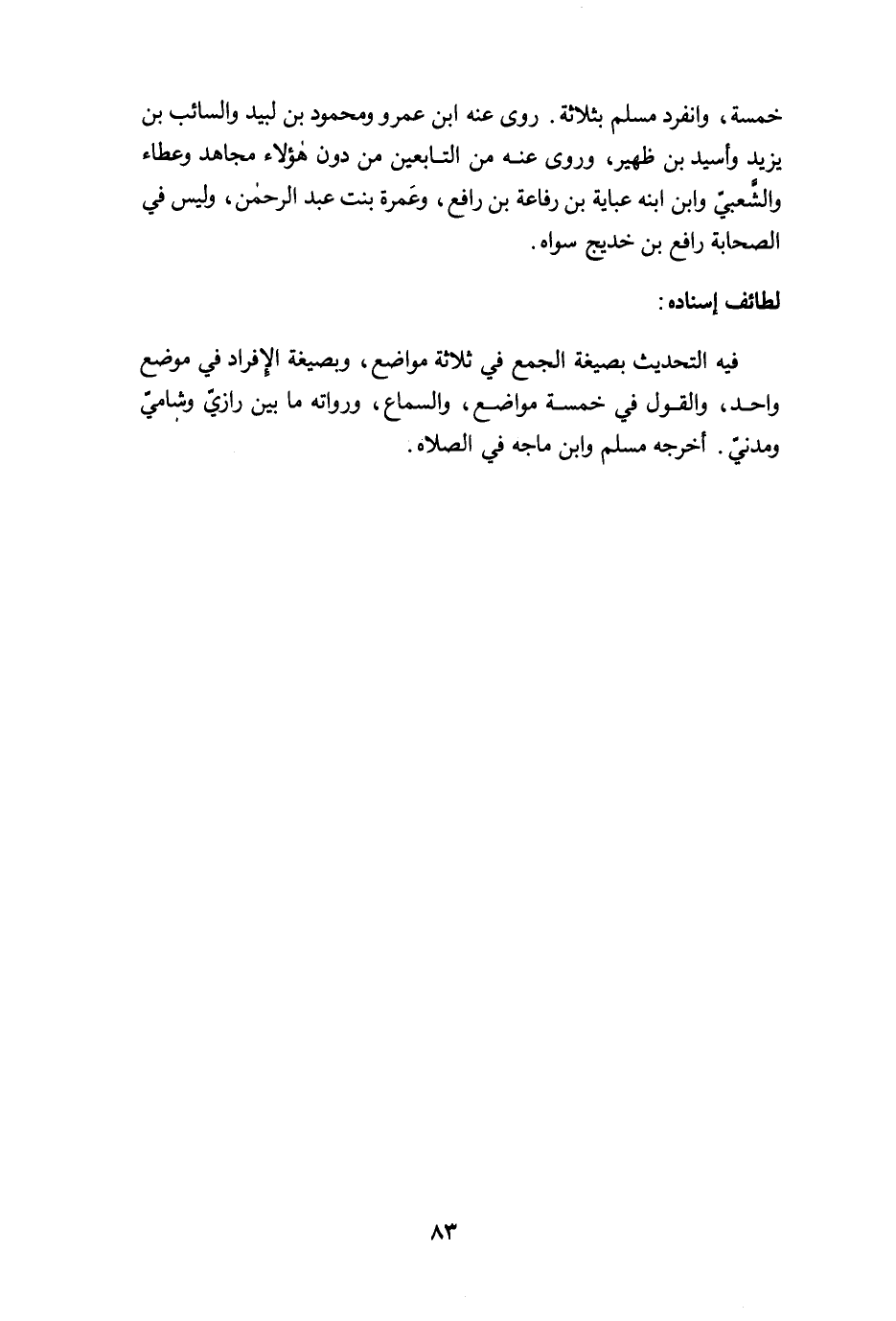 فيه التحديث بصيغة الجمع في ثلاثة مواضع، وبصيغة الإفراد في موضع واحد، والقول في خمسة مواضع، والسماع، ورواته ما بين رازيّ وشاميّ ومدنيّ. أخرجه مسلم وابن ماجه في الصلاة.