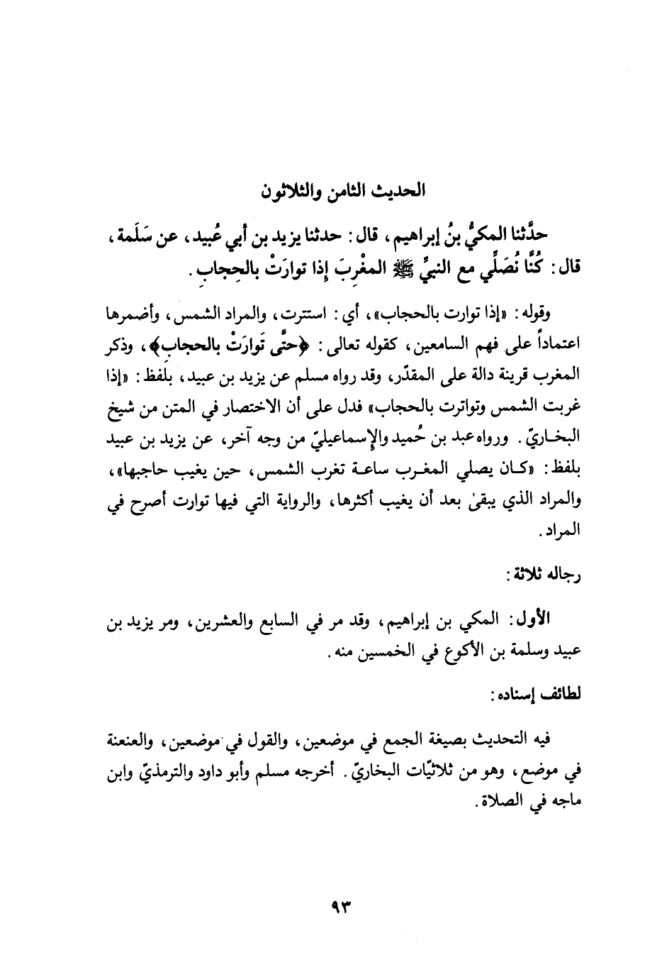 فيه التحديث بصيغة الجمع في موضعين، والقول في موضعين، والعنعنة في موضع، وهو من ثلاثيّات البخاريّ. أخرجه مسلم وأبو داود والترمذيّ وابن ماجه في الصلاة.