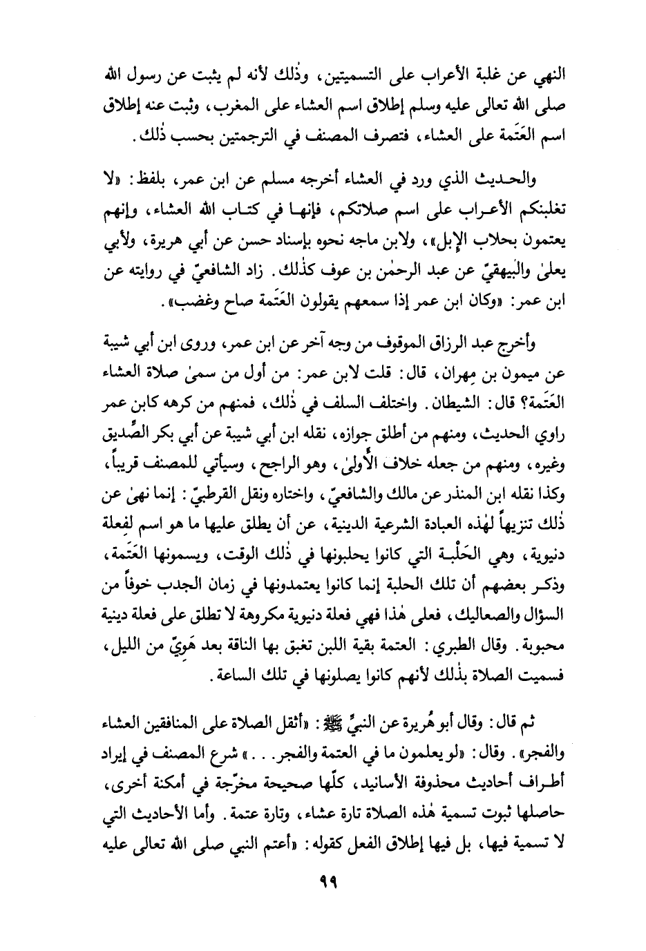 والحديث الذي ورد في العشاء أخرجه مسلم عن ابن عمر، بلفظ: "لا تغلبنكم الأعراب على اسم صلاتكم، فإنها في كتاب الله العشاء، وإنهم يعتمون بحلاب الإبل"، ولابن ماجه نحوه بإسناد حسن عن أبي هريرة، ولأبي يعلى والبيهقيّ عن عبد الرحمن بن عوف كذلك. زاد الشافعيّ في روايته عن ابن عمر: "وكان ابن عمر إذا سمعهم يقولون العَتَمة صاح وغضب".
