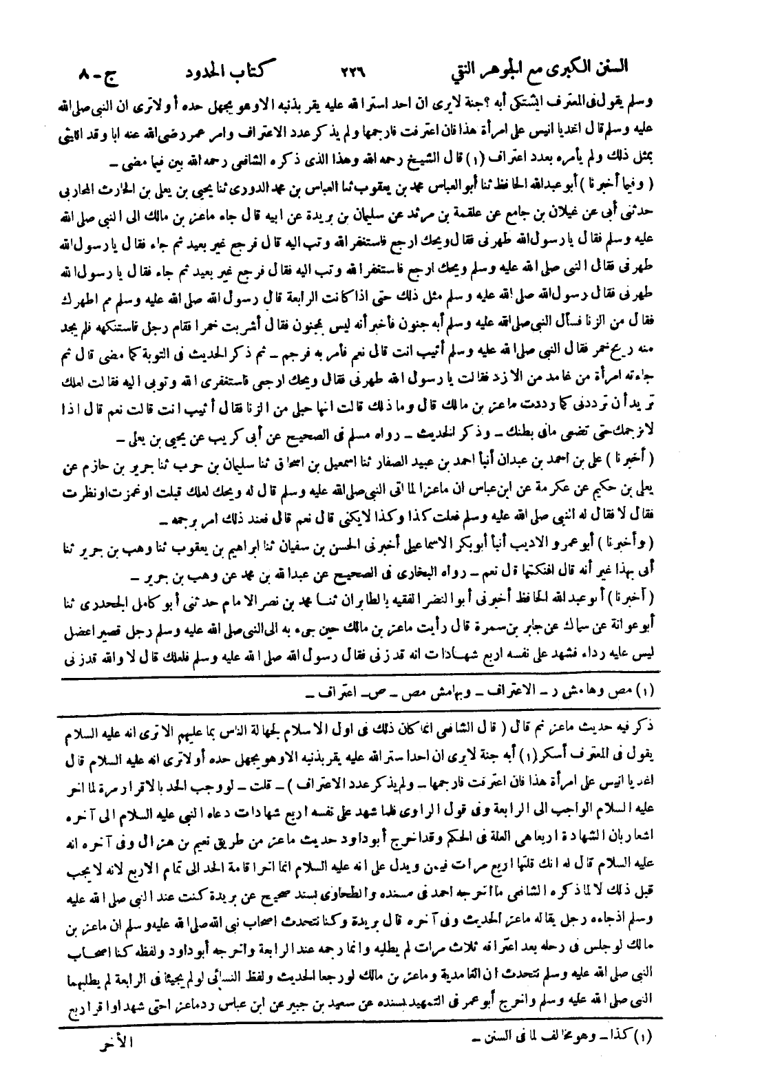 ذكر فيه حديث ماعز ثم قال (قال الشافعي انما كان ذلك في اول الاسلام لجهالة الناس بما عليهم الا ترى انه عليه السلام يقول في المعترف أسكر (1) أبه جنة لا يرى ان احدا ستر الله عليه يقر بذنبه الا وهو يجهل حده أو لا ترى انه عليه السلام قال اغد يا انيس على امرأة هذا فان اعترفت فارجمها - ولم يذكر عدد الاعتراف) - قلت - لو وجب الحد بالاقرار مرة لما اخر عليه السلام الواجب إلى الرابعة وفى قول الراوى فلما شهد على نفسه اربع شهادات دعاه النبي عليه السلام إلى آخره اشعار بان الشهادة اربعا هي العلة في الحكم وقد اخرج أبو داود حديث ماعز من طريق نعيم بن هزال وفى آخره انه عليه السلام قال له انك قلتها اربع مرات فبمن ويدل على انه عليه السلام انما اخر اقامة الحد إلى تمام الاربع لانه لا يجب قبل ذلك لا لما ذكره الشافعي ما اخرجه احمد في مسنده والطحاوى بسند صحيح عن بريدة كنت عند النبي صلى الله عليه وسلم إذ جاءه رجل يقال له ما عز الحديث وفى آخره قال بريدة وكنا نتحدث اصحاب نبى الله صلى الله عليه وسلم ان ما عز بن مالك لو جلس في رحله بعد اعترافه ثلاث مرات لم يطلبه وانما رجمه عند الرابعة واخرجه أبو داود ولفظه كنا اصحاب