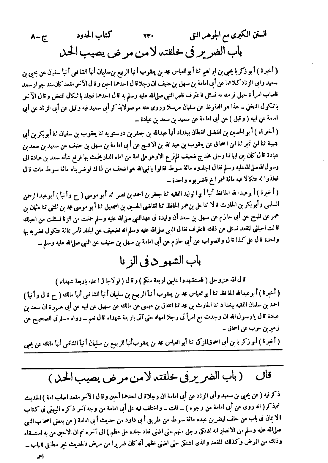 ذكر فيه (عن يحيى بن سعيد وأبى الزنا عن أبى امامة ان رجلا قال احدهما أحبن وقال الآخر مقعد اصاب امة) الحديث ثم ذكر (انه روى عن أبى امامة من وجوه) - قلت - واختلف فيه على أبى امامة من وجه آخر ذكره البيهقى في كتاب الايمان في باب من حلف ليضربن عبده مائة سوط من طريق أبى داود من حديث أبى امامة (عن بعض اصحاب النبي صلى الله عليه وسلم من الانصار انه اشتكى رجل منهم حتى اضنى فعاد جلده على عظم) إلى آخره ثم ان الاحبن من به استسقاء وذلك من المرض وكذلك المقعد والذى اشتكى حتى اضنى فظهر أنه كان ضريرا من مرض فالحديث غير مطابق للباب -