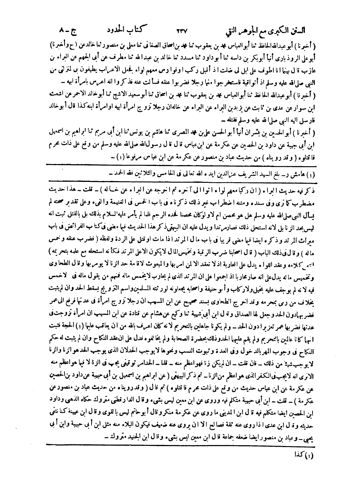 ذكر فيه حديث البراء (ان ركبا معهم لواء اتوا إلى آخره ثم اخرجه عن البراء عن خاله) - قلت - هذا حديث مضطرب كما ترى وفى سنده ومتنه اضطراب غير ذلك ذكرناه في باب الخمس في الغنيمة والفئ وعلى تقدير صحته لم يسأل النبي صلى الله عليه وسلم هل هو محصن ام لا ولو كان محصنا فحده الرجم فلما لم يأمر عليه السلام بذلك بل بالقتل ثبت انه ليس بحد الزنا بل لانه استحل ذلك فصار مرتدا ويدل عليه ان البيهقى ذكر هذا الحديث فيما مضى في كتاب الفرائض في باب ميراث المرتد وذكره ايضا فيما مضى قريبا في باب مال المرتد إذا مات أو قتل على الردة ولفظه (فضرب عنقه وخمس ماله) وقال في ذلك الباب (قال اصحابنا ضرب الرقبة وتخميس المال لا يكون الا على المرتد فكأنه استحله مع علمه بتحريمه) انتهى كلامه وعقد اللواء يدل على المحاربة إذ لا تعقد الا لمن امر بها والمبعوث لاقامة حد الزنا لا يومر بها وقال الطحاوي وتخميس ماله يدل على انه صار محاربا إذ اجمعوا على ان المرتد الذى لم يحارب لا يخمس ماله فمنهم من يقول ماله فئ لا خمس فيه لانه لم يوجف عليه بخيل ولا ركاب وأبو حنيفة واصحابه يجعلونه لورثته المسلمين واسم التزويج يسقط الحد وان لم يثبت بخلاف من رمى بمحرمه وقد اخرج الطحاوي بسند صحيح عن ابن المسيب ان رجلا تزوج امرأة في عدتها فرفع إلى عمر فضربهما دون الحد وجعل لها الصداق وقال ابن أبى شيبة ثنا وكيع عن هشام عن قتادة عن ابن المسيب ان امرأة تزوجت في عدتها فضربها عمر تعزيرا دون الحد - ولم يكونا جاهلين بالتحريم لانه كان اعرف بالله من ان يعاقب عليها (1) الحجة فثبت انهما كانا عالمين بالتحريم ولم يقم عليهما الحد وذلك بحضرة الصحابة ولم يخالفوه فدل على ان عقد النكاح وان لم يثبت له حكم النكاح في وجوب المهر بالدخول وفى العدة وثبوت النسب ونحوها لا يوجب الحد لان الذى يوجب الحد هو الزنا والزنا