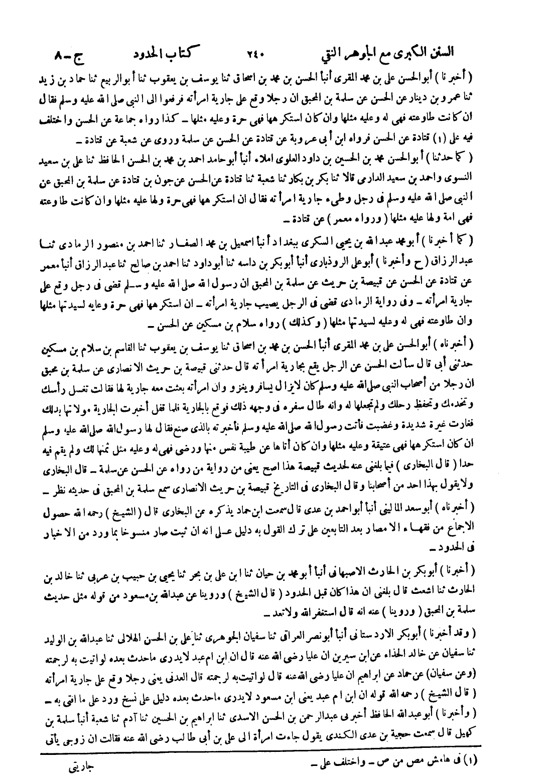 (ح وأخبرنا) أبو على الروذبارى أنبأ أبو بكر بن داسه ثنا أبو داود ثنا احمد بن صالح ثنا عبد الرزاق أنبأ معمر عن قتادة عن الحسن عن قبيصة بن حريث عن سلمة بن المحبق ان رسول الله صلى الله عليه وسلم قضى في رجل وقع على جارية امرأته - وفي رواية الرمادي قضى في الرجل يصيب جارية امرأته - ان استكرهها فهى حرة وعليه لسيدتها مثلها وان طاوعته فهى له وعليه لسيدتها مثلها (وكذلك) رواه سلام بن مسكين عن الحسن - (أخبرناه) أبو الحسن على بن محمد المقرى أنبأ الحسن بن محمد بن اسحاق ثنا يوسف بن يعقوب ثنا القاسم بن سلام بن مسكين حدثنى أبى قال سألت الحسن عن الرجل يقع بجارية امرأته قال حدثنى قبيصة بن حريث الانصاري عن سلمة بن محبق ان رجلا من أصحاب النبي صلى الله عليه وسلم كان لا يزال يسافر ويغزو وان امرأته بعثت معه جارية لها فقالت تغسل رأسك وتخدمك وتحفظ رحلك ولم تجعلها له وانه طال سفره في وجهه ذلك فوقع بالجارية فلما قفل أخبرت الجارية مولاتها بذلك فغارت غيرة شديدة وغضبت فأتت رسول الله صلى الله عليه وسلم فأخبرته بالذى صنع فقال لها رسول الله صلى الله عليه وسلم ان كان استكرهها فهى عتيقة وعليه مثلها وان كان أتاها عن طيبة نفس منها ورضى فهى له وعليه مثل ثمنها لك ولم يقم فيه حدا (قال البخاري) فيما بلغني عنه لحديث قبيصة هذا اصح يعنى من رواية من رواه عن الحسن عن سلمة - قال البخاري ولا يقول بهذا احد من أصحابنا وقال البخاري في التاريخ قبيصة بن حريث الانصاري سمع سلمة بن المحبق في حديثه نظر - (أخبرناه) أبو سعد المالينى أنبأ أبو أحمد بن عدى قال سمعت ابن حماد يذكره عن البخاري قال (الشيخ) رحمه الله حصول الاجماع من فقهاء الامصار بعد التابعين على ترك القول به دليل على انه ان ثبت صار منسوخا بما ورد من الاخبار في الحدود
