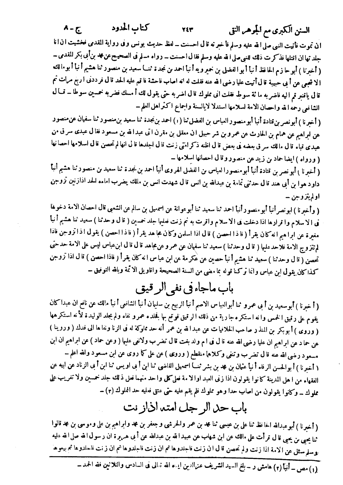 - (أخبرنا) أبو نصر بن قتادة أنبأ أبو منصور العباس بن الفضل الهروي أنبأ احمد بن نجدة ثنا سعيد بن منصور ثنا هشيم أنبأ داود هو ابن أبى هند قال حدثنى ثمامة بن عبد الله بن انس قال شهدت انس بن مالك يضرب اماءه الحد إذا زنين تزوجن اولم يتزوجن