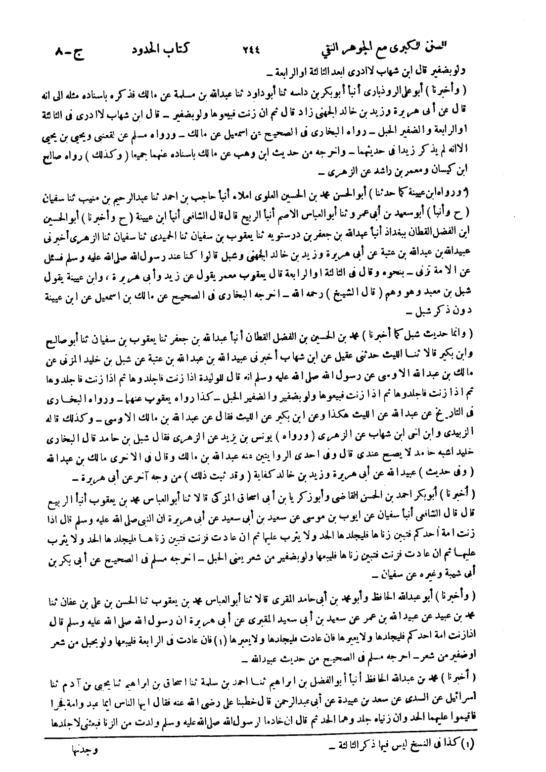 - (وأخبرنا) أبو عبد الله الحافظ وأبو محمد بن أبى حامد المقرى قالا ثنا أبو العباس محمد بن يعقوب ثنا الحسن بن على بن عفان ثنا محمد بن عبيد عن عبيد الله بن عمر عن سعيد بن أبى سعيد المقبرى عن أبى هريرة ان رسول الله صلى الله عليه وسلم قال إذا زنت امة احدكم فليجلدها ولا يعيرها فان عادت فليجلدها ولا يعيرها (1) فان عادت في الرابعة فليبعها ولو بحبل من شعر أو ضفير من شعر - اخرجه مسلم في الصحيح من حديث عبيد الله