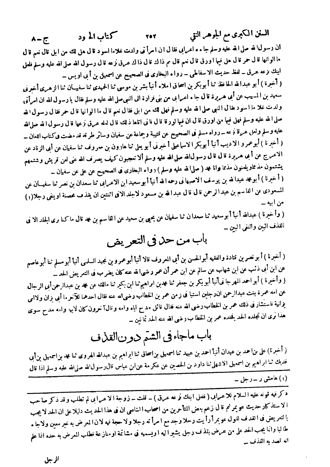 ذكر فيه قوله عليه السلام للاعرابي (فلعل ابنك نزعه عرق) - قلت - زوجة الاعرابي لم تطلب وقد ذكر صاحب الاستذكار حديث عويمر قال زعم بعض المتأخرين من اصحاب الشافعي ان في هذا الحديث دليلا على ان الحد لا يجب بالتعريض في القذف لقول عويمر أرأيت رجلا وجد مع امرأته رجلا ولا حجة فيه لان المعرض به غير معين ولا جاء طالبا وانما يجب الحد على من عرض يقذف رجل يشير إليه أو يسميه في مشاتمة أو منازعة فطلب العرض به حده إذا علم انه تصد به القذف -