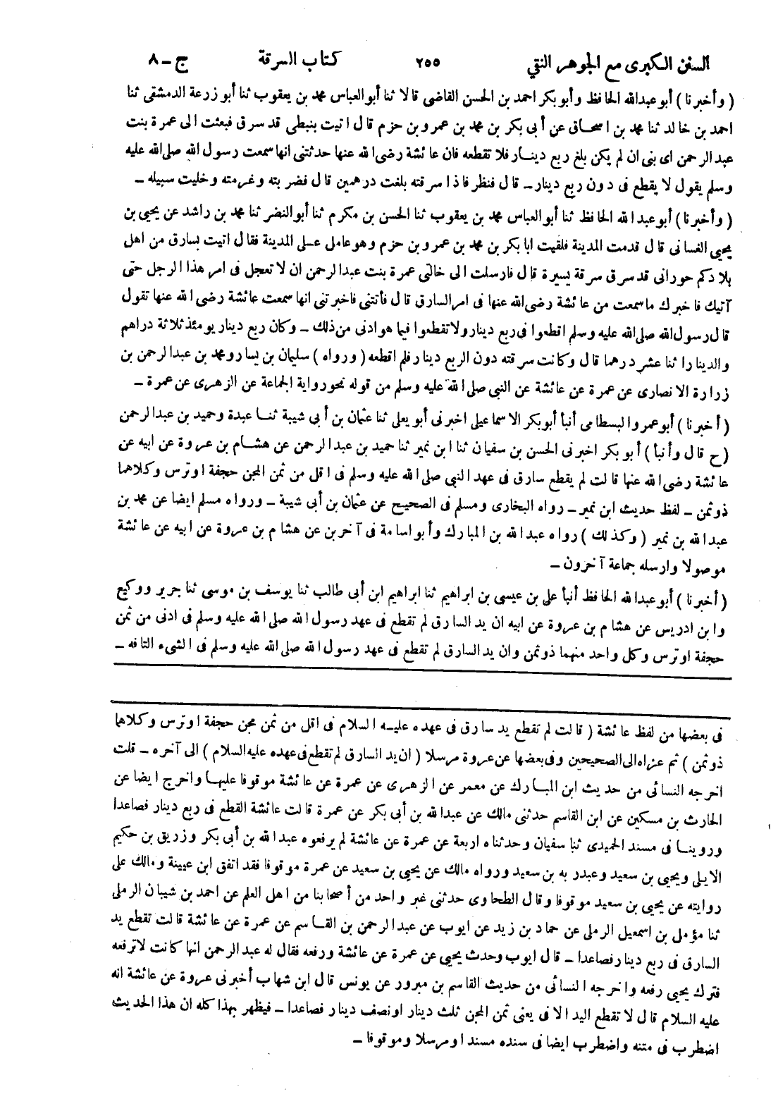 في بعضها من لفظ عائشة (قالت لم تقطع يد سارق في عهده عليه السلام في اقل من ثمن مجن حجفة أو ترس وكلاهما ذو ثمن) ثم عزاه إلى الصحيحين وفى بعضها عن عروة مرسلا (ان يد السارق لم تقطع في عهده عليه السلام) إلى آخره - قلت اخرجه النسائي من حديث ابن المبارك عن معمر عن الزهري عن عمرة عن عائشة موقوفا عليها واخرج ايضا عن الحارث بن مسكين عن ابن القاسم حدثنى مالك عن عبد الله بن أبى بكر عن عمرة قالت عائشة القطع في ربع دينار فصاعدا وروينا في مسند الحميدى ثنا سفيان وحدثناه اربعة عن عمرة عن عائشة لم يرفعوه عبد الله بن أبى بكر وزريق بن حكيم الايلى ويحيى بن سعيد وعبد ربه بن سعيد ورواه مالك عن يحيى بن سعيد عن عمرة موقوفا فقد اتفق ابن عيينة ومالك على