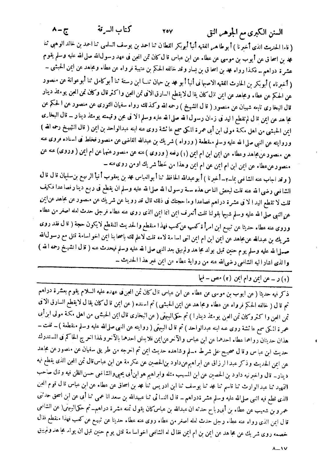 ذكر فيه حديثا (عن ايوب بن موسى عن عطاء عن ابن عباس قال كان ثمن المجن في عهده عليه السلام يقوم بعشرة دراهم ثم قال (خالفه الحكم فرواه عن عطاء ومجاهد عن ايمن الحبشى) ثم اسنده (عن ايمن قال كان يقال لا يقطع السارق الا في ثمن المجن واكثر وكان ثمن المجن يومئذ دينارا) ثم حكى البيهقى (عن البخاري قال ايمن الحبشى من اهل مكة مولى ابن أبى عمرة المكى سمع عائشة روى عنه ابنه عبد الواحد) ثم قال البيهقى (روايته عن النبي صلى الله عليه وسلم منقطعة) - قلت - هذان حديثان رواهما عطاء احدهما عن ابن عباس والآخر عن ايمن فلا يعلل احدهما بالآخر ولهذا اخرج الحاكم في المستدرك حديث ابن عباس وقال صحيح على شرط مسلم وشاهده حديث ايمن ثم اخرجه من طريق سفيان عن منصور عن مجاهد عن ايمن الحديث وذكر عبد الرزاق عن ابراهيم عن داود بن الحصين عن عكرمة عن ابن عباس قال ثمن المجن الذى يقطع فيه دينار - قال واخبرنيه داود بن الحصين عن ابن المسيب مثله وابراهيم هو ابن أبى يحيى والشافعي حسن الظن فيه وقال صاحب التمهيد ثنا عبد الوارث ثنا قاسم ثنا محمد ثنا يوسف ثنا ابن ادريس ثنا محمد بن اسحاق عن عطاء عن ابن عباس قال قوم المجن الذي قطع فيه النبي صلى الله عليه وسلم عشرة دراهم - قال النسائي ثنا عبيد الله بن سعد انا عمى ثنا أبى عن ابن اسحق حدثنى عمرو بن شعيب عن عطاء بن أبى رباح ححدثه ان عبد الله بن عباس كان يقول ثمنه عشرة دراهم - ثم حكى البيهقى (عن الشافعي قال إيمن الذى رواه عنه عطاء رجل حدث لعله اصغر من عطاء روى عنه عطاء حديثا عن تبيع عن كعب فهذا منقطع فقال خصمه روى شريك عن مجاهد عن ايمن بن ام ايمن فقال له الشافعي اخو اسامة قتل يوم حنين قبل ان يولد مجاهد ولم يبق