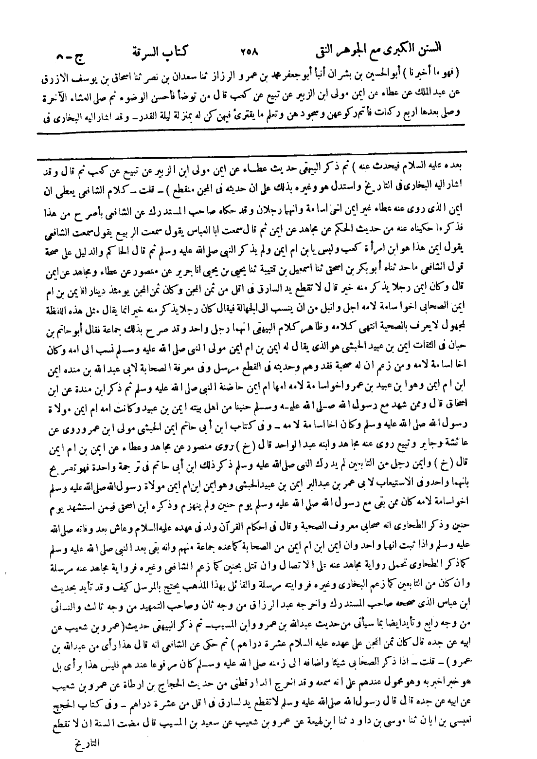 بعده عليه السلام فيحدث عنه) ثم ذكر البيهقى حديث عطاء عن ايمن مولى ابن الزبير عن تبيع عن كعب ثم قال وقد اشار إليه البخاري في التاريخ واستدل هو وغيره بذلك على ان حديثه في المجن منقطع) - قلت - كلام الشافعي يعطى ان ايمن الذى روى عنه عطاء غير ايمن اخى اسامة وانهما رجلان وقد حكاه صاحب المستدرك عن الشافعي بأصرح من هذا فذكر ما حكيناه عنه من حديث الحكم عن مجاهد عن ايمن ثم قال سمعت ابا العباس يقول سمعت الربيع يقول سمعت الشافعي يقول ايمن هذا هو ابن امرأة كعب وليس بابن ام ايمن ولم يذكر النبي صلى الله عليه وسلم ثم قال الحاكم والدليل على صحة قول الشافعي ما حدثناه أبو بكر بن اسحق ثنا اسمعيل بن قتيبة ثنا يحيى بن يحيى انا جرير عن منصور عن عطاء ومجاهد عن ايمن قال وكان ايمن رجلا يذكر منه خير قال لا تقطع يد السارق في اقل من ثمن المجن وكان ثمن المجن يومئذ دينارا فايمن بن ام ايمن الصحابي اخو اسامة لامه اجل وانبل من ان ينسب إلى الجهالة فيقال كان رجلا يذكر منه خير انما يقال مثل هذه اللفظة لمجهول لا يعرف بالصحبة انتهى كلامه وظاهر كلام البيهقى انهما رجل واحد وقد صرح بذلك جماعة فقال أبو حاتم بن حبان في الثقات ايمن بن عبيد الحبشى هو الذى يقال له ايمن بن ام ايمن مولى النبي صلى الله عليه وسلم نسب إلى امه كان اخا اسامة لامه ومن زعم ان له صحبة فقد وهم وحديثه في القطع مرسل وفى معرفة الصحابة لابي عبد الله بن منده ايمن ابن ام ايمن وهو ابن عبيد بن عمرو اخو اسامة لامه امهما ام ايمن حاضنة النبي صلى الله عليه وسلم ثم ذكر ابن مندة عن ابن اسحاق قال وممن شهد مع رسول الله صلى الله عليه وسلم حنينا من اهل بيته ايمن بن عبيد وكانت امه ام ايمن مولاة رسول الله صلى الله عليه وسلم وكان اخا اسامة لامه - وفى كتاب ابن أبى حاتم ايمن الحبشى مولى ابن عمرو روى عن عائشة وجابر وتبيع روى عنه مجاهد وابنه عبد الواحد قال (خ) روى منصور عن مجاهد وعطاء عن ايمن بن ام ايمن قال (خ) وايمن رجل من التابعين لم يدرك النبي صلى الله عليه وسلم ذكر ذلك ابن أبى حاتم في ترجمة واحدة فهو تصريح بانهما واحد وفى الاستيعاب لابي عمر بن عبد البر ايمن بن عبيد الحبشى وهو ايمن ابن ايمن مولاة رسول الله صلى الله عليه وسلم اخو اسامة لامه كان ممن بقى مع رسول الله صلى الله عليه وسلم يوم حنين ولم ينهزم وذكره ابن اسحق فيمن استشهد يوم حنين وذكر الطحاوي انه صحابي معروف الصحبة وقال في احكام القرآن ولد في عهده عليه السلام وعاش بعد وفاته صلى الله عليه وسلم وإذا ثبت انهما واحد وان ايمن ابن ام ايمن من الصحابة كما عده جماعة منهم وانه بقى بعد النبي صلى الله عليه وسلم كما ذكر الطحاوي تحمل رواية مجاهد عنه على الاتصال وان قتل بحنين كما زعم الشافعي وغيره فرواية مجاهد عنه مرسلة