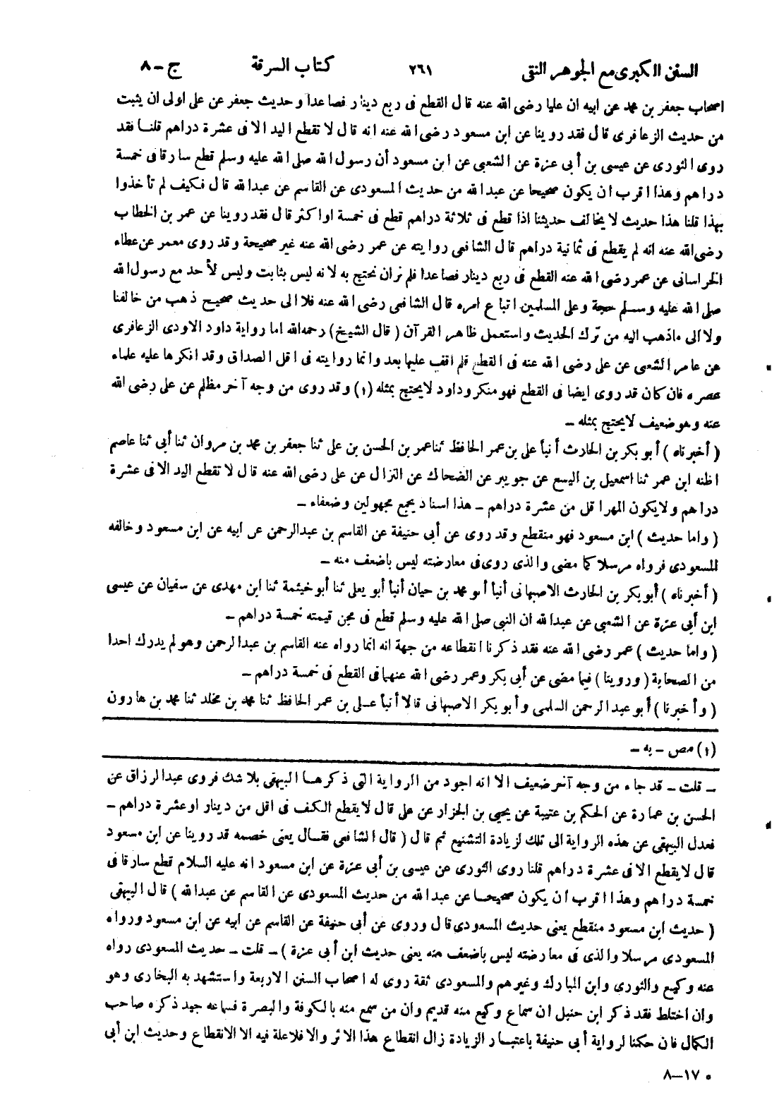 - قلت - قد جاء من وجه آخر ضعيف الا انه اجود من الرواية التى ذكرها البيهقى بلا شك فروى عبد الرزاق عن الحسن بن عمارة عن الحكم بن عتيبة عن يحيى بن الجزار عن على قال لا يقطع الكف في اقل من دينار أو عشرة دراهم - فعدل البيهقى عن هذه الرواية إلى تلك لزيادة التشنيع ثم قال (قال الشافعي فقال يعين خصمه قد روينا عن ابن مسعود قال لا يقطع الا في عشرة دراهم قلنا روى الثوري عن عيسى بن أبى عزة عن ابن مسعود انه عليه السلام قطع سارقا في خمسة دراهم وهذا اقرب ان يكون صحيحا عن عبد الله من حديث المسعودي عن القاسم عن عبد الله) قال البيهقى (حديث ابن مسعود منقطع يعنى حديث المسعودي قال وروى عن أبى حنيفة عن القاسم عن أبيه عن ابن مسعود ورواه المسعودي مرسلا والذى في معارضته ليس باضعف منه يعنى حديث ابن أبى عزة) - قلت - حديث المسعودي رواه عنه وكيع والثوري وابن المبارك وغيرهم والمسعودي ثقة روى له اصحاب السنن الاربعة واستشهد به البخاري وهو وان اختلط فقد ذكر ابن حنبل ان سماع وكيع منه قديم وان من سمع منه بالكوفة والبصرة فسماعه جيد ذكره صاحب الكمال فان حكمنا لرواية أبى حنيفة باعتبار الزيادة زال انقطاع هذا الاثر والا فلا علة فيه الا الانقطاع وحديث ابن أبى