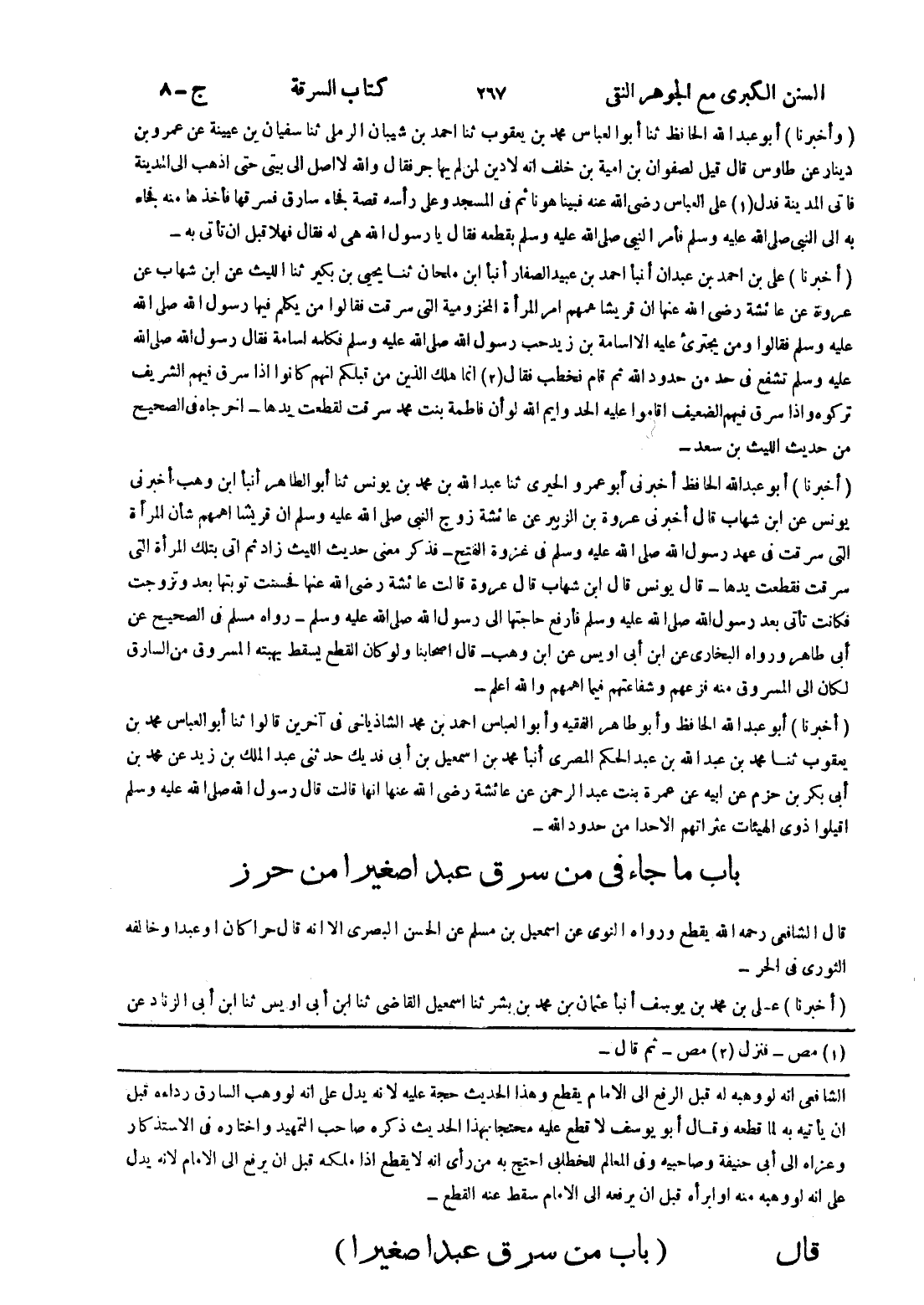 الشافعي انه لو وهبه قبل الرفع إلى الامام يقطع وهذا الحديث حجة عليه لانه يدل على انه لو وهب السارق رداءه قبل ان يأتيه به لما قطعه وقال أبو يوسف لا قطع عليه محتجا بهذا الحديث ذكره صاحب التمهيد واختاره في الاستذكار وعزاه إلى أبى حنيفة وصاحبيه وفى المعالم للخطابي احتج به من رأى انه لا يقطع إذا ملكه قبل ان يرفع إلى الامام لانه يدل على انه لو وهبه منه أو ابرأه قبل ان يرفعه إلى الامام سقط عنه القطع - قال (باب من سرق عبدا صغيرا)