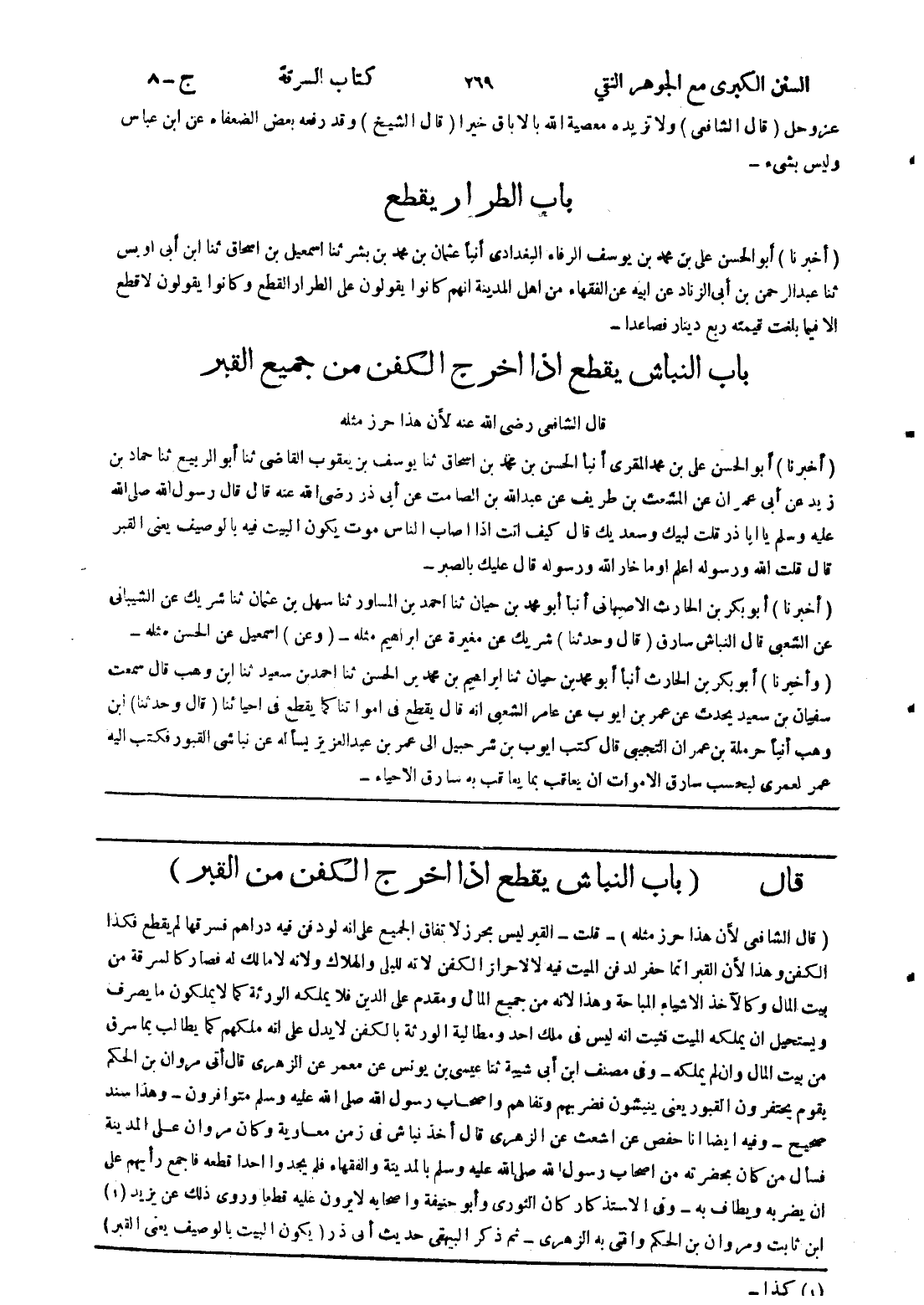 قال (باب النباش يقطع إذا اخرج الكفن من القبر) (قال الشافعي لان هذا حرز مثله) - قلت - القبر ليس بحرز لاتفاق الجميع على انه لو دفن فيه دراهم فسرقها لم يقطع فكذا الكفن وهذا لان القبر انما حفر لدفن الميت فيه لا لاحراز الكفن لانه للبلى والهلاك ولانه لا مالك له فصار كالسرقة من بيت المال وكالآخذ الاشياء المباحة وهذا لانه من جميع المال ومقدم على الدين فلا يملكه الورثة كما لا يملكون ما يصرف ويستحيل ان يملكه الميت فثبت انه ليس في ملك احد ومطالبة الورثة بالكفن لا يدل على انه ملكهم كما يطالب بما سرق من بيت المال وان لم يملكه - وفى مصنف ابن أبى شيبة ثنا عيسى بن يونس عن معمر عن الزهري يقال أتى مروان بن الحكم بقوم يحتفرون القبور يعنى ينبشون فضربهم وتفاهم واصحاب رسول الله صلى الله عليه وسلم متوافرون - وهذا سند صحيح - وفيه ايضا انا حفص عن اشعث عن الزهري قال أخذ نباش في زمن معاوية وكان مروان على المدينة فسأل من كان بحضرته من اصحاب رسول الله صلى الله عليه وسلم بالمدينة والفقهاء فلم يجدوا احدا قطعه فاجمع رأيهم على
