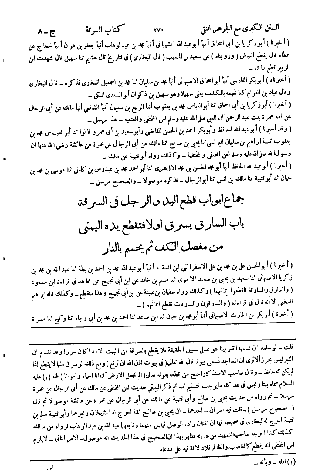 قلت - لو سلمنا ان تسمية القبر بيتا هو على سبيل الحقيقة فلا يقطع بالسرقة من البيت الا إذا كان حرزا وقد تقدم ان القبر ليس بحرز ألا ترى ان المساجد تسمى بيوتا قال الله تعالى (في بيوت اذن الله ان ترفع) ومع ذلك لو سرق منها لا يقطع إذا لم يكن ثم حافظ - وقال صاحب الاستذكار احتج من قطعه بقوله تعالى (الم نجعل الارض كفاتا احياء وامواتا) فانه (1) عليه السلام سماه بيتعا وليس في هذا كله ما يوجب التسليم له - ثم ذكر البيهقى حديث لعن المختفى عن مالك عن أبى الرجال عن عمرة مرسلا - ثم رواه من حديث يحيى بن صالح وأبى قتيبة عن مالك عن أبى الرجال عن عمرة عن عائشة موصولا ثم قال (الصحيح مرسل) - قلت فيه امران - احدهما - ان يحيى بن صالح ثقة اخرج له الشيخان وغيرهما وأبو قتيبة سلم بن قتيبة اخرج له البخاري في صحيحه فهذان ثقتان زاد الوصل فيقبل منهما وتابعهما عبد الله بن عبد الوهاب فرواه عن مالك كذلك كذا اخرجه صاحب التمهيد من حديثه فظهر بهذا ان الصحيح في هذا الحديث انه موصول - الامر الثاني - لا يلزم لعن المختفى انه يقطع كالغاصب والظالم فلا دلالة فيه على مدعاه -