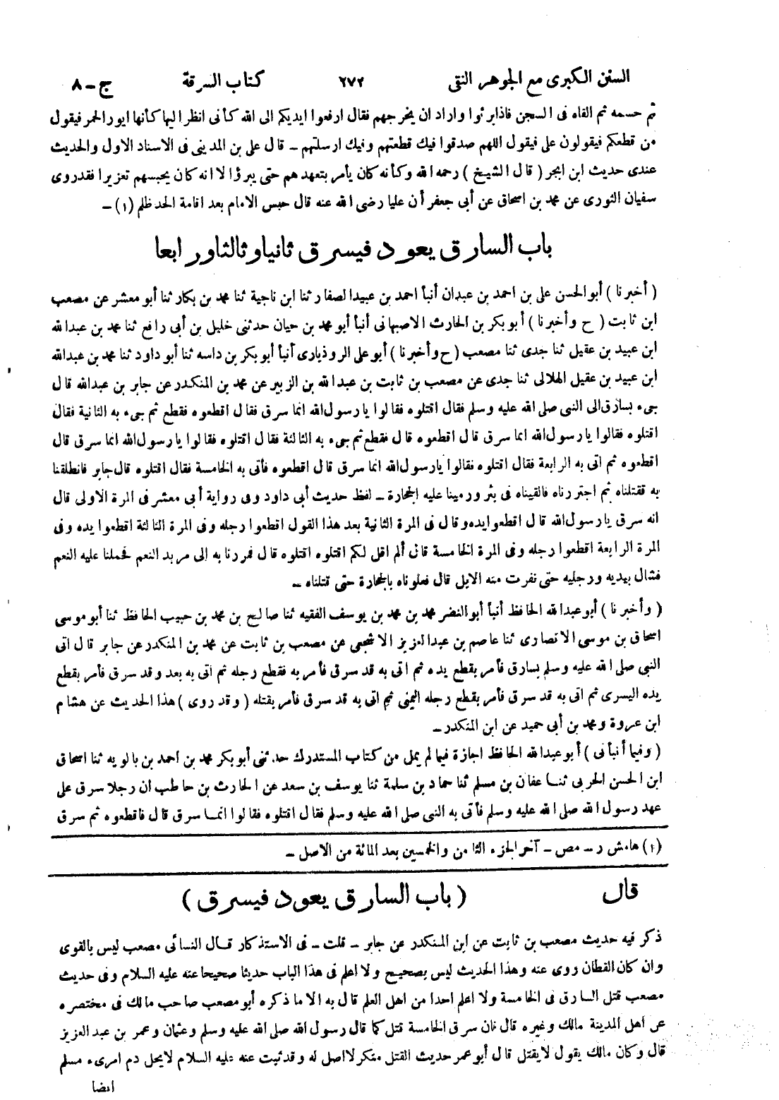 قال (باب السارق يعود فيسرق) ذكر فيه حديث مصعب بن ثابت عن ابن المنكدر عن جابر - قلت - في الاستذكار قال النسائي مصعب ليس بالقوى وان كان القطان روى عنه وهذا الحديث ليس بصحيح ولا اعلم في هذا الباب حديثا صحيحا عنه عليه السلام وفى حديث مصعب قتل السارق في الخامسة ولا اعلم احدا من اهل العلم قال به الا ما ذكره أبو مصعب صاحب مالك في مختصره عن اهل المدينة مالك وغيره قال فان سرق الخامسة قتل كما قال رسول الله صلى الله عليه وسلم وعثمان وعمر بن عبد العزيز قال وكان مالك يقول لا يقتل قال أبو عمر حديث القتل منكر لا اصل له وقد ثبت عنه عليه السلام لا يحل دم امرئ مسلم