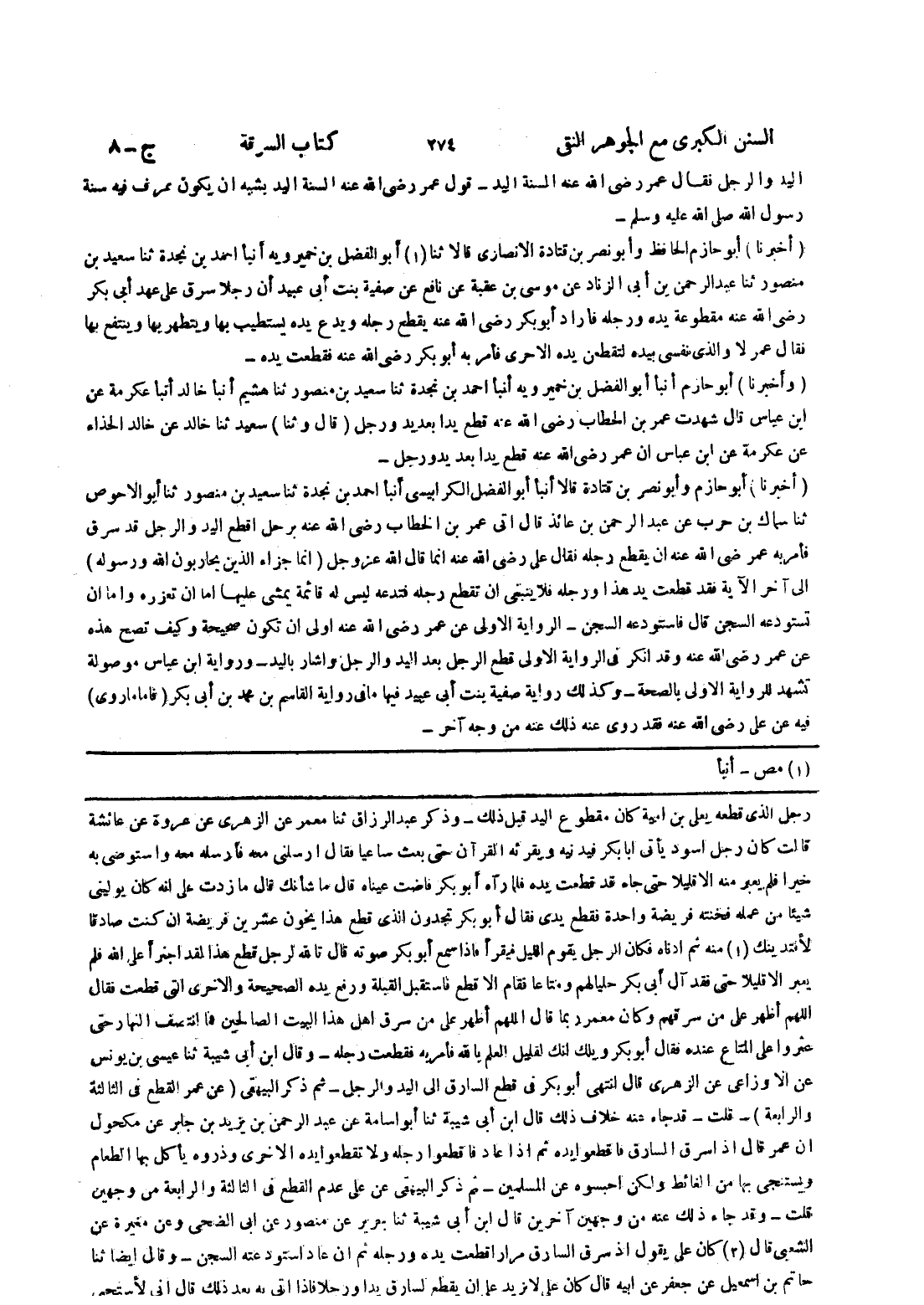 رجل الذى قطعه يعلى بن امية كان مقطوع اليد قبل ذلك - وذكر عبد الرزاق ثنا معمر عن الزهري عن عروة عن عائشة قالت كان رجل اسود يأتي ابا بكر فيدنيه ويقرئه القرآن حتى بعث ساعيا فقال ارسلني معه فأرسله معه واستوصى به خيرا فلم يعبر منه الا قليلا حتى جاء قد قطعت يده فلما رآه أبو بكر فاضت عيناه قال ما شأنك قال ما زدت على انه كان يوليني شيئا من عمله فخنته فريضة واحدة فقطع يدى فقال أبو بكر تجدون الذى قطع هذا يخون عشرين فريضة ان كنت صادقا لافتدينك (1) منه ثم ادناه فكان الرجل يقوم الليل فيقرأ فإذا سمع أبو بكر صوته قال تا لله لرجل قطع هذا لقد اجترأ على الله فلم يعبر الا قليلا حتى فقد آل أبى بكر حليالهم ومتاعا فقام الاقطع فاستقبل القبلة ورفع يده الصحيحة والاخرى التى قطعت فقال اللهم أظهر على من سرقهم وكان معمر ربما قال اللهم أظهر على من سرق اهل هذا البيت الصالحين فما انتصف النهار حتى عثروا على المتاع عنده فقال أبو بكر ويلك انك لقليل العلم بالله فأمر به فقطعت رجله - وقال ابن أبى شيبة ثنا عيسى بن يونس عن الاوزاعي عن الزهري قال انتهى أبو بكر في قطع السارق إلى اليد والرجل - ثم ذكر البيهقى (عن عمر القطع في الثالثة والرابعة) - قلت - قد جاء عنه خلاف ذلك قال ابن أبى شيبة ثنا أبو اسامة عن عبد الرحمن بن يزيد بن جابر عن مكحول ان عمر قال إذا سرق السارق فاقطعوا يده ثم إذا عاد فاقطعوا رجله ولا تقطعوا يده الاخرى وذروه يأكل بها الطعام