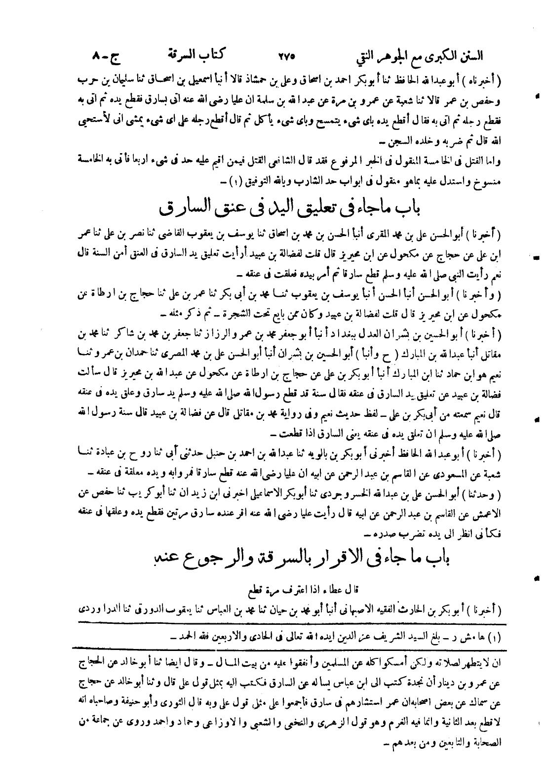 ان لا يتطهر لصلاته ولكن أمسكوا كله عن المسلمين وأنفقوا عليه من بيت المال - وقال ايضا ثنا أبو خالد عن الحجاج عن عمرو بن دينار أن نجدة كتب إلى ابن عباس يسأله عن السارق فكتب إليه بمثل قول على قال وثنا أبو خالد عن حجاج عن سماك عن بعض اصحابه ان عمر استشارهم في سارق فأجمعوا على مثل قول على وبه قال الثوري وأبو حنيفة وصاحباه انه لا قطع بعد الثانية وانما فيه الغرم وهو قول الزهري والنخعي والشعبى والاوزاعي وحماد واحمد وروى عن جماعة من الصحابة والتابعين ومن بعدهم -