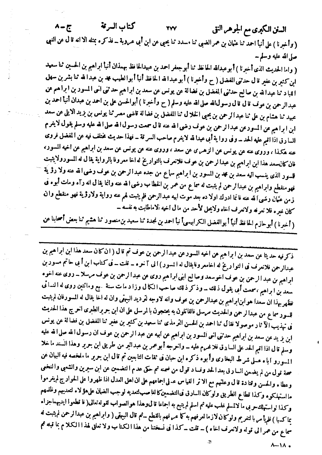 ذكر فيه حديثا عن سعد بن ابراهيم عن اخيه المسور عن عبد الرحمن بن عوف ثم قال (ان كان سعد هذا ابن ابراهيم بن عبد الرحمن فلا نعرف في التواريخ له اخا معروفا يقال له المسور) إلى آخره - قلت - في كتاب ابن أبى حاتم مسور بن ابراهيم بن عبد الرحمن بن عوف اخو سعد وصالح ابني ابراهيم روى عن عبد الرحمن بن عوف مرسلا - روى عنه اخوه سعد بن ابراهيم، سمعت أبى يقول ذلك - وذكر ذلك صاحب الكمال وزاد مات سنة سبع ومائتين روى له النسائي فظهر بهذا ان سعد هو ابن ابراهيم بن عبد الرحمن بن عوف وانه لا وجه لترديد البيهقى وان له اخا يقال له المسور فان لم يثبت للمسور سماع من عبد الرحمن والحديث مرسل فالقائلون به يحتجون بالمرسل على ان ابن جرير الطبري اخرج هذا الحديث في تهذيب الآثار موصولا فقال ثنا احمد بن الحسن الترمذي ثنا سعيد بن كثير بن عفير ثنا المفضل بن فضالة عن يونس ابن يزيد عن سعد بن ابراهيم حدثنى اخى المسور بن ابراهيم عن ابيه عن عبد الرحمن بن عوف ان رسول الله صلى الله عليه