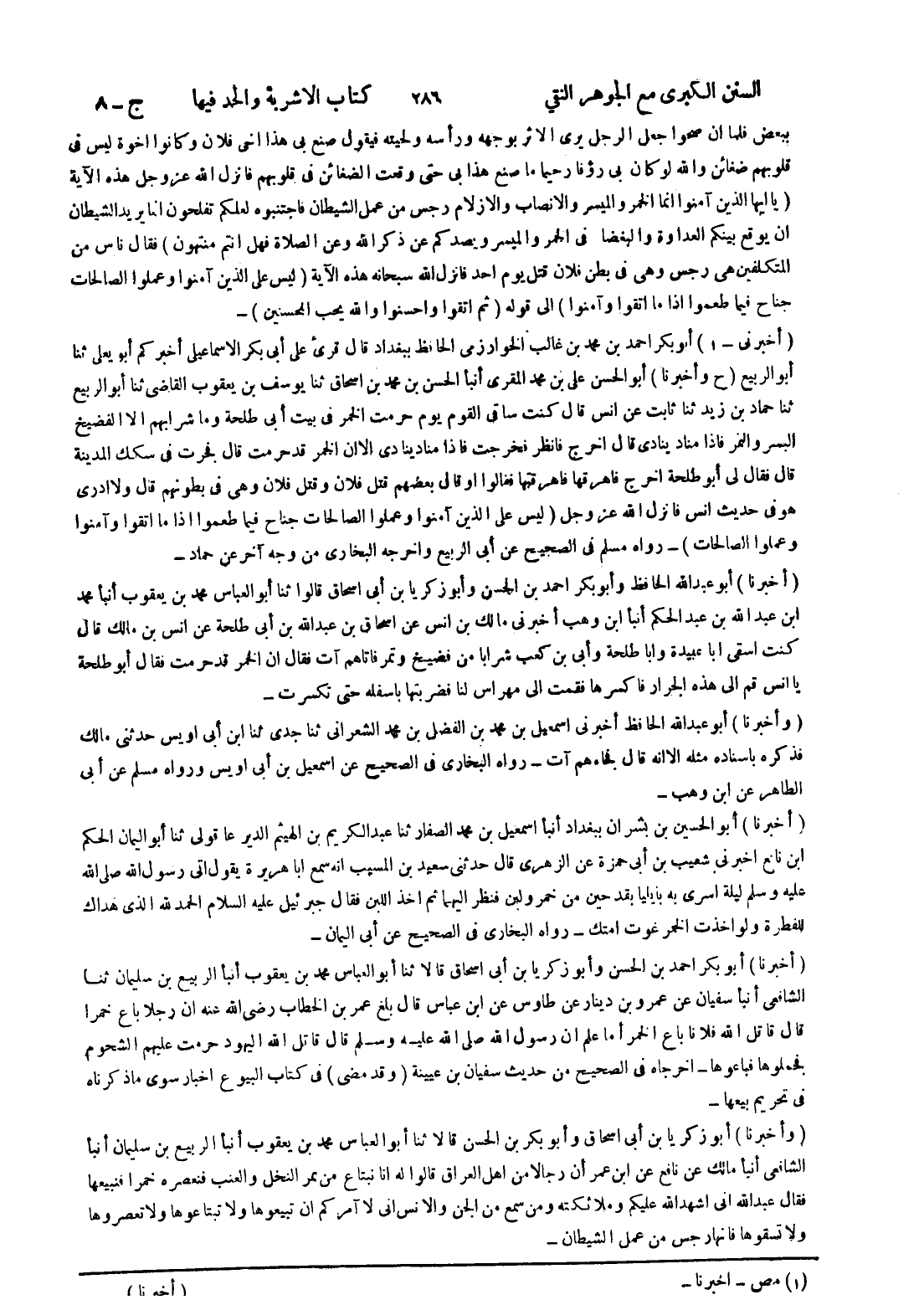 (ح وأخبرنا) أبو الحسن على بن محمد المقرى أنبأ الحسن بن محمد بن اسحاق ثنا يوسف بن يعقوب القاضى ثنا أبو الربيع ثنا حماد بن زيد ثنا ثابت عن انس قال كنت ساقى القوم يوم حرمت الخمر في بيت أبى طلحة وما شرابهم الا الفضيخ البسر والتمر فإذا مناد ينادى قال اخرج فانظر فخرجت فإذا مناد ينادى الا ان الخمر قد حرمت قال فجرت في سكك المدينة قال فقال لى أبو طلحة اخرج فاهرقها فاهرقتها فقالوا أو قال بعضهم قتل فلان وقتل فلان وهى في بطونهم قال ولا ادرى هو في حديث انس فانزل الله عز وجل (ليس على الذين آمنوا وعملوا الصالحات جناح فيما طعموا إذا ما اتقوا وآمنوا وعملوا الصالحات) - رواه مسلم في الصحيح عن أبى الربيع واخرجه البخاري من وجه آخر عن حماد