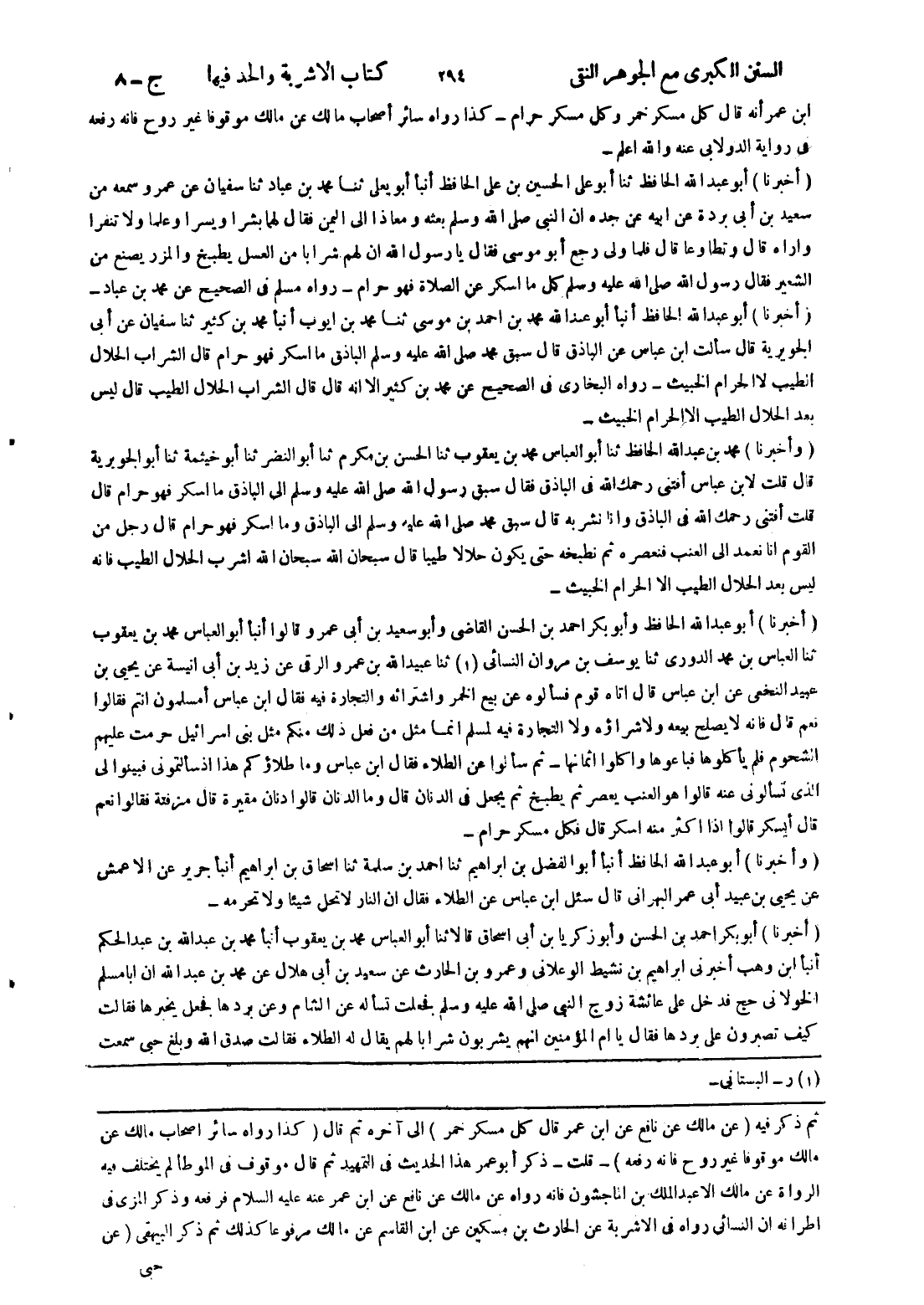 ثم ذكر فيه (عن مالك عن نافع عن ابن عمر قال كل مسكر خمر) إلى آخره ثم قال (كذا رواه سائر اصحاب مالك عن مالك موقوفا غير ورح فانه رفعه) - قلت - ذكر أبو عمر هذا الحديث في التمهيد ثم قال موقوف في الموطأ لم يختلف فيه الرواة عن مالك الا عبد الملك بن اما جشون فانه رواه عن مالك عن نافع عن ابن عمر عنه عليه السلام فرفعه وذكر المزى في اطرافه ان النسائي رواه في الاشربة عن الحارث بن مسكين عن ابن القاسم عن مالك مرفوعا كذلك ثم ذكر البيهقى (عن