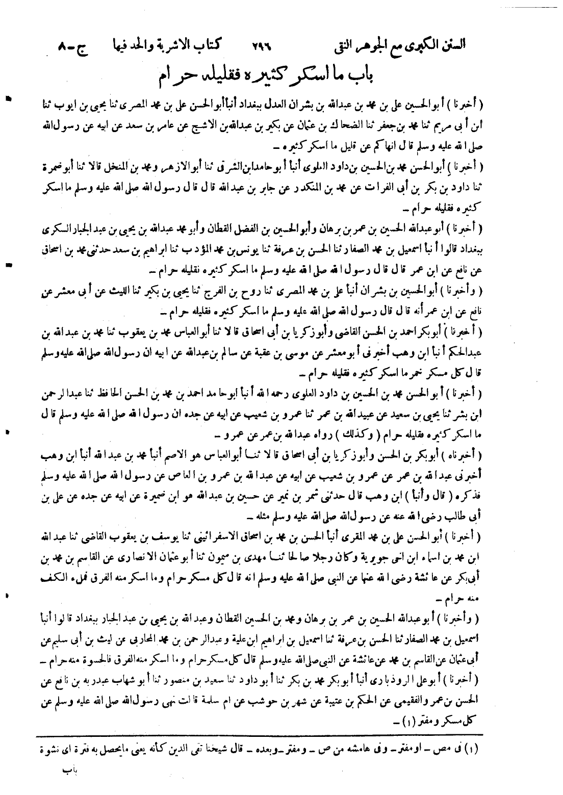 - (أخبرنا) أبو عبد الله الحسين بن عمر بن برهان وأبو الحسين بن الفضل القطان وأبو محمد عبد الله بن يحيى بن عبد الجبار السكرى ببغداد قالوا أنبأ اسمعيل بن محمد الصفار ثنا الحسن بن عرفة ثنا يونس بن محمد المؤدب ثنا ابراهيم بن سعد حدثنى محمد بن اسحاق عن نافع عن ابن عمر قال قال رسول الله صلى الله عليه وسلم ما اسكر كثيره فقليله حرام