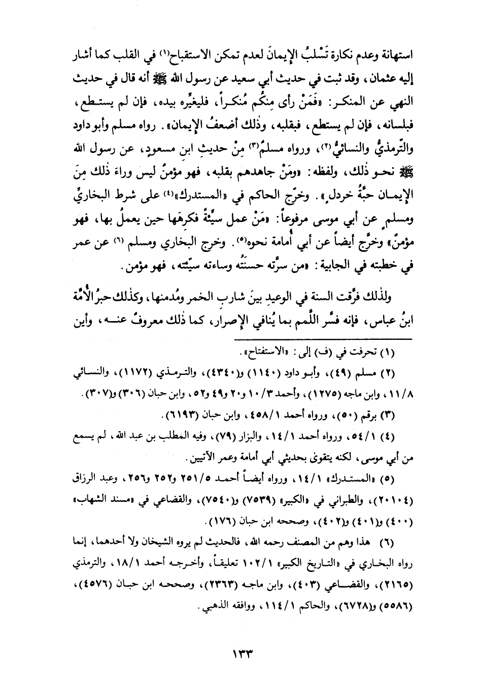 استهانة وعدم نكارة تسلب الإيمان لعدم تمكن الاستقباح (¬1) في القلب كما أشار إليه عثمان، وقد ثبت في حديث أبي سعيد عن رسول الله - صلى الله عليه وسلم - أنه قال في حديث النهي عن المنكر: " فمن رأى منكم مُنكراً، فليغيِّره بيده، فإن لم يستطع، فبلسانه، فإن لم يستطع، فبقلبه، وذلك أضعف الإيمان ". رواه مسلم وأبو داود والترمذي والنسائي (¬2)، ورواه مسلمٌ (¬3) من حديث ابن مسعودٍ، عن رسول الله - صلى الله عليه وسلم - نحو ذلك، ولفظه: " ومن جاهدهم بقلبه، فهو مؤمنٌ ليس وراء ذلك من الإيمان حبة خردلٍ ". وخرج الحاكم في " المستدرك " (¬4) على شرط البخاري ومسلمٍ عن أبي موسى مرفوعاً: " من عمل سيئةً فكرِهَها حين يعمل بها، فهو مؤمنٌ " وخرَّج أيضاً عن أبي أُمامة نحوه (¬5). وخرج البخاري ومسلم (¬6) عن عمر في خطبته في الجابية: " من سرَّته حسنَتُه وساءته سيئته، فهو مؤمن ".