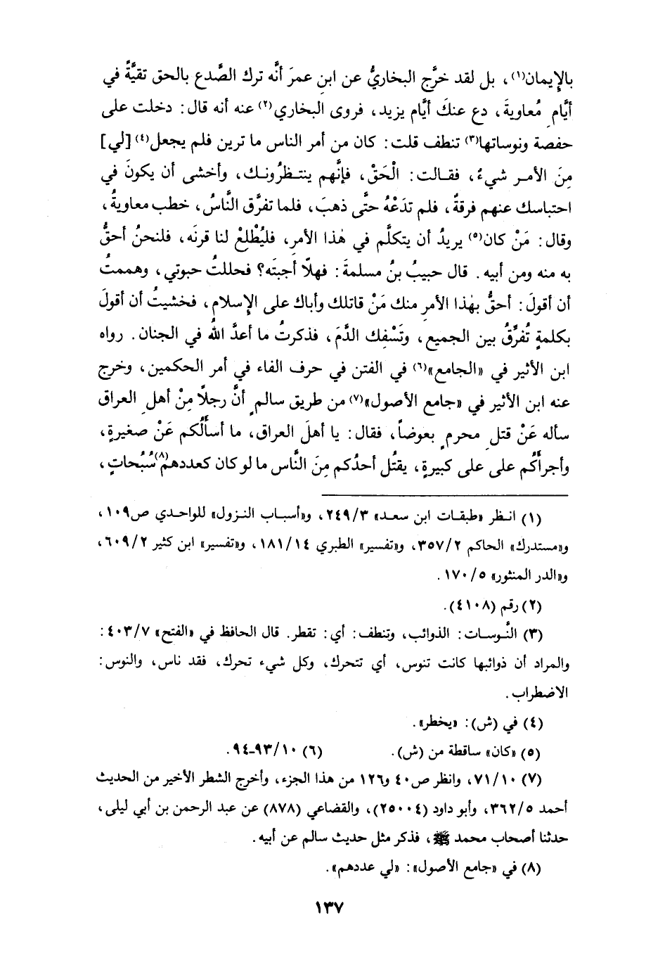 بالإيمان (¬1)، بل لقد خرَّج البخاري عن ابن عمر أنه ترك الصدع بالحق تقيَّةً في أيام معاوية، دع عنك أيام يزيد، فروى البخاري (¬2) عنه أنه قال: دخلت على حفصة ونوساتها (¬3) تنطف قلت: كان من أمر الناس ما ترين فلم يجعل (¬4) [لي] من الأمر شيءٌ، فقالت: الحق، فإنهم ينتظرونك، وأخشى أن يكون في احتباسك عنهم فرقةٌ، فلم تدعهُ حتى ذهب، فلما تفرَّق الناسُ، خطب معاوية، وقال: من كان (¬5) يريد أن يتكلم في هذا الأمر، فليُطْلِعْ لنا قرنه، فلنحن أحق به منه ومن أبيه. قال حبيب بن مسلمة: فهلاّ أجبته؟ فحللت حبوتي، وهممت أن أقول: أحق بهذا الأمر منك من قاتلك وأباك على الإسلام، فخشيت أن أقول بكلمة تفرق بين الجميع، وتسفك الدم، فذكرت ما أعد الله في الجنان. رواه ابن الأثير في " الجامع " (¬6) في الفتن في حرف الفاء في أمر الحكمين، وخرج عنه ابن الأثير في " جامع الأصول " (¬7) من طريق سالمٍ أن رجلاً من أهل العراق سأله عن قتلِ محرمٍ بعوضاً، فقال: يا أهل العراق، ما أسألكم عن صغيرةٍ، وأجرأكم على كبيرةٍ، يقتل أحدكم من الناس ما لو كان كعددهم (¬8) سُبُحاتٍ،