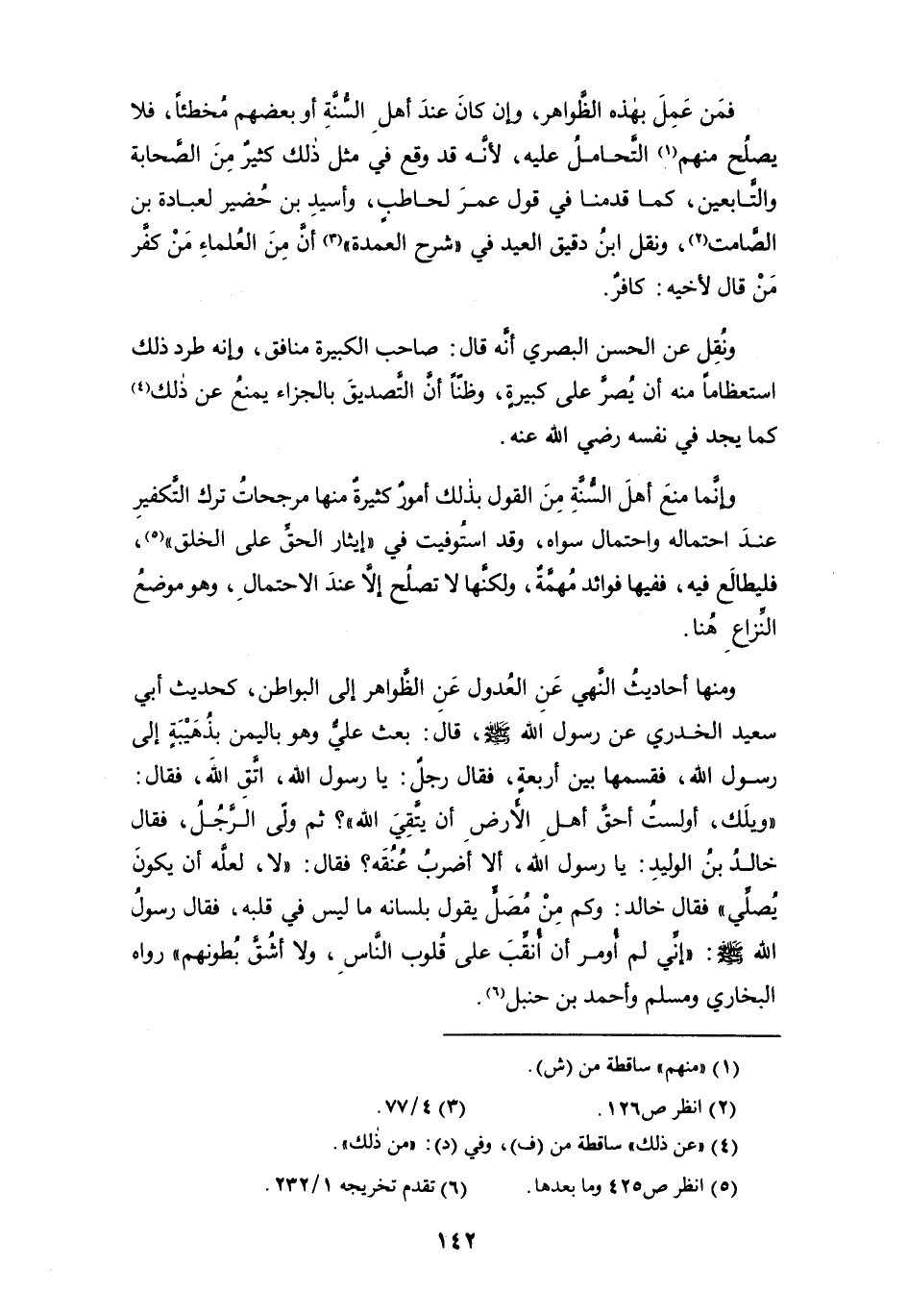 ومنها أحاديث النهي عن العُدول عن الظواهر إلى البواطن، كحديث أبي سعيد الخدري عن رسول الله - صلى الله عليه وسلم -، قال: بعث عليٌّ وهو باليمن بذُهَيْبَةٍ إلى رسول الله، فقسمها بين أربعة، فقال رجل: يا رسول الله، اتق الله، فقال: " ويلك، أولستُ أحق أهل الأرض أن يتقي الله "؟ ثم ولّى الرجل، فقال خالد بن الوليد: يا رسول الله، ألا أضربُ عنقه؟ فقال: " لا، لعله أن يكون يصلي " فقال خالد: وكم مِنْ مُصَلٍّ يقول بلسانه ما ليس في قلبه، فقال رسول الله - صلى الله عليه وسلم -: " إني لم أُومر أن أُنقِّبَ على قلوب الناس، ولا أشُقَّ بطونهم " رواه البخاري ومسلم وأحمد بن حنبل (¬6).