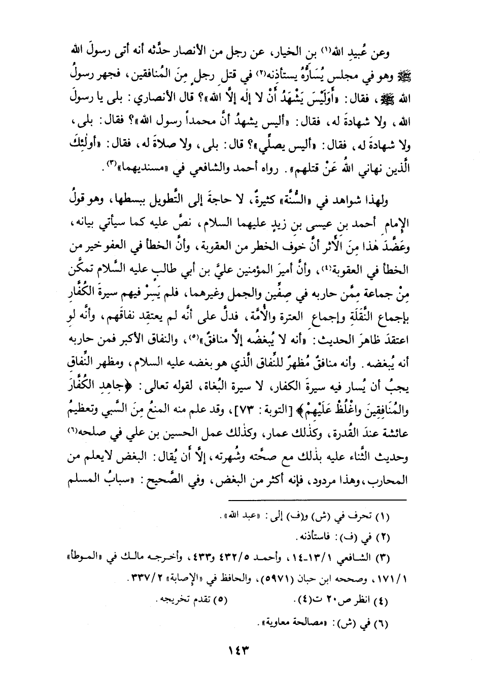 ولهذا شواهد في " السنة " كثيرةٌ، لا حاجة إلى التطويل ببسطها، وهو قول الإمام أحمد بن عيسى بن زيدٍ عليهما السلام، نصَّ عليه كما سيأتي بيانه، وعَضَّدَ هذا من الأثر أن خوف الخطر من العقوبة، وأن الخطأ في العفو خير من الخطأ في العقوبة (¬4)، وأن أمير المؤمنين علي بن أبي طالب عليه السلام تمكن من جماعة ممن حاربه في صِفِّين والجمل وغيرهما، فلم يَسِرْ فيهم سيرة الكفار بإجماع النقلة وإجماع العترة والأمة، فدل على أنه لم يعتقد نفاقهم، وأنه لو اعتقد ظاهر الحديث: " أنه لا يبغضه إلاَّ منافق " (¬5)، والنفاق الأكبر فمن حاربه أنه يبغضه. وأنه منافقٌ مُظهرٌ للنفاق الذي هو بغضه عليه السلام، ومظهر النِّفاق يجب أن يُسار فيه سيرة الكفار، لا سيرة البغاة، لقوله تعالى: {جَاهِدِ الْكُفَّارَ وَالْمُنَافِقِينَ وَاغْلُظْ عَلَيْهِم} [التوبة: 73]، وقد علم منه المنع من السَّبي وتعظيم عائشة عند القدرة، وكذلك عمار، وكذلك عمل الحسين بن علي في صلحه (¬6) وحديث الثناء عليه بذلك مع صحته وشهرته، إلاَّ أن يقال: البغض لا يعلم من المحارب، وهذا مردود، فإنه أكثر من البغض، وفي الصحيح: "سباب المسلم
