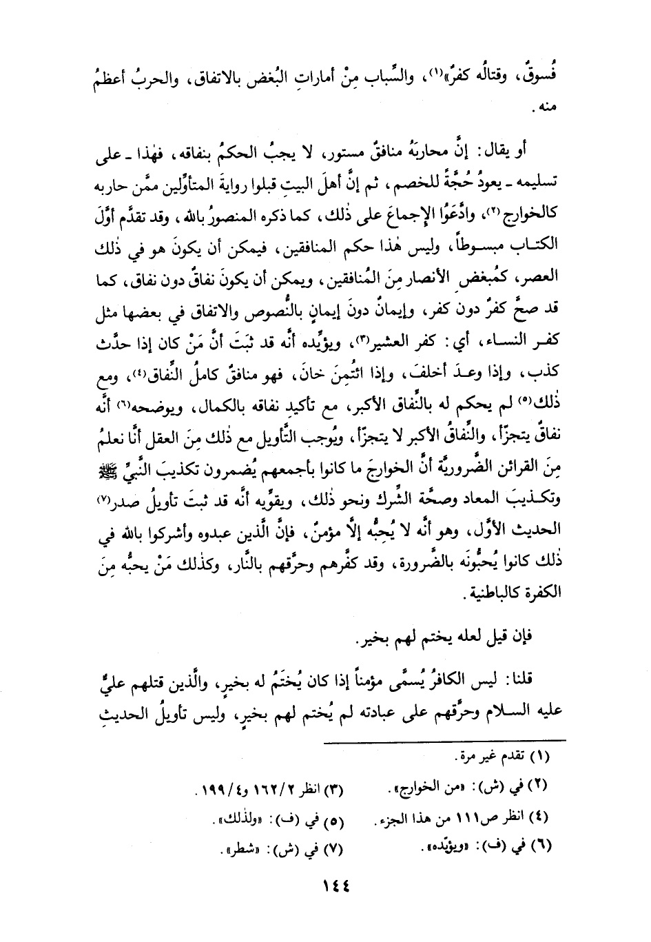 أو يقال: إن محاربه منافقٌ مستور، لا يجب الحكم بنفاقه، فهذا -على تسليمه- يعود حجةً للخصم، ثم إن أهل البيت قبلوا رواية المتأولين ممن حاربه كالخوارج (¬2)، وادَّعَوُا الإجماع على ذلك، كما ذكره المنصور بالله، وقد تقدم أول الكتاب مبسوطاً، وليس هذا حكم المنافقين، فيمكن أن يكون هو في ذلك العصر، كمُبغضِ الأنصار من المنافقين، ويمكن أن يكون نفاقٌ دون نفاق، كما قد صحَّ كفرٌ دون كفر، وإيمانٌ دون إيمانٍ بالنصوص والاتفاق في بعضها مثل كفر النساء، أي: كفر العشير (¬3)، ويؤيده أنه قد ثبت أن من كان إذا حدَّث كذب، وإذا وعد أخلف، وإذا ائتمن خان، فهو منافقٌ كامل النِّفاق (¬4)، ومع ذلك (¬5) لم يحكم له بالنِّفاق الأكبر، مع تأكيد نفاقه بالكمال، ويوضحه (¬6) أنه نفاقٌ يتجزّأ، والنِّفاق الأكبر لا يتجزّأ، ويوجب التأويل مع ذلك من العقل أنا نعلم من القرائن الضرورية أن الخوارج ما كانوا بأجمعهم يُضمرون تكذيبَ النبي - صلى الله عليه وسلم - وتكذيب المعاد وصحة الشِّرك ونحو ذلك، ويقوِّيه أنه قد ثبت تأويل صدر (¬7) الحديث الأول، وهو أنه لا يحبه إلاَّ مؤمن، فإن الذين عبدوه وأشركوا بالله في ذلك كانوا يحبونه بالضرورة، وقد كفَّرهم وحرَّقهم بالنار، وكذلك من يحبه من الكفرة كالباطنية.