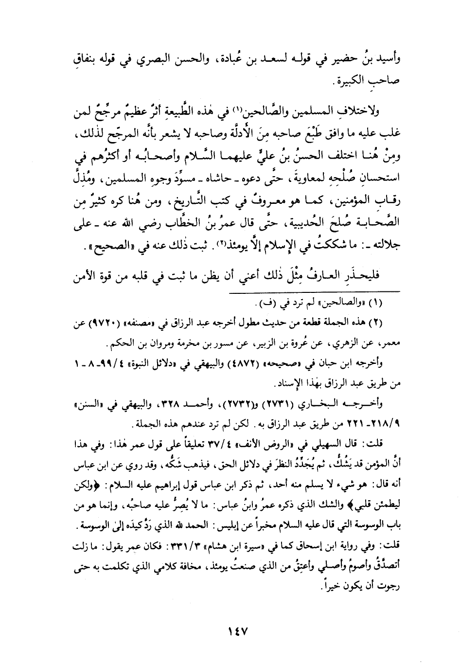 قلت: قال السهيلي في " الروض الأنف " 4/ 37 تعليقاً على قول عمر هذا: وفي هذا أن المؤمن قد يَشُكُّ، ثم يُجَدِّدُ النظر في دلائل الحق، فيذهب شَكُّه، وقد روي عن ابن عباس أنه قال: هو شيء لا يسلم منه أحد، ثم ذكر ابن عباس قول إبراهيم عليه السلام: {ولكن ليطمئن قلبي} والشك الذي ذكره عمر وابن عباس: ما لا يُصِرُّ عليه صاحبه، وإنما هو من باب الوسوسة التي قال عليه السلام مخبراً عن إبليس: الحمد لله الذي ردَّ كيده إلى الوسوسة.