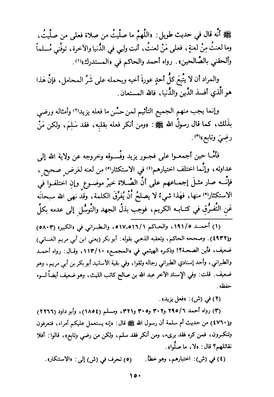 فأمَّا حين أجمعوا على فجور يزيد وفُسوقه وخروجه عن ولاية الله إلى عداوته، وإنما اختلف اختيارهم (¬4) في الاستكثار (¬5) من لعنه لغرضٍ صحيحٍ، فإنه صار مثل إجماعهم على أن الصلاة خير موضوعٍ وإنِ اختلفوا في الاستكثار (5) منها، فهذا شيءٌ لا يصلح أن يُفرِّق الكلمة، وقد نهى الله سبحانه عن التفرق في كتابه الكريم، فوجب بذل الجهد والتَّوسُّل إلى عدمه بكلِّ