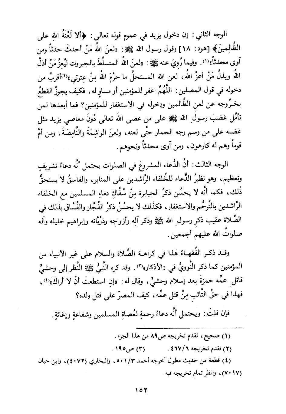 الوجه الثاني: إن دخول يزيد في عموم قوله تعالى: {ألا لَعْنَةُ الله على الظالمين} [هود: 18] وقول رسول الله - صلى الله عليه وسلم -: " لعن الله من أحدث حدثاً ومن آوى محدثاً " (¬1). وفيما رُوِيَ عنه - صلى الله عليه وسلم -: " لعن الله المتسلِّطَ بالجبروت ليُعِزَّ من أذل الله ويذلَّ من أعز الله، لعن الله المستحل ما حرَّم الله من عترتي " (¬2) أقرب من دخوله في قول المصلين: اللهم اغفر للمؤمنين أو مساوٍ له، فكيف يجوز القطع بخروجه عن لعن الظالمين ودخوله في الاستغفار للمؤمنين؟ فما أبعدها لمن تأمل غضب رسول الله - صلى الله عليه وسلم - على من عصى الله تعالى دون معاصي يزيد مثل غضبه على من وسم وجه الحمار حتَّى لعنه، ولعن الواشِمَة والنَّامِصَةَ، ومن أمَّ قوماً وهم له كارهون، ومن آوى محدثاً ونحوهم.