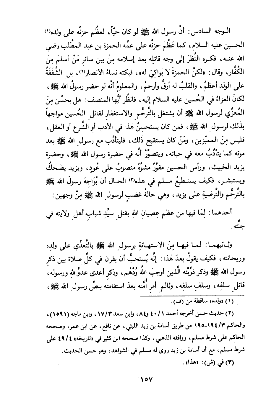 الوجه السادس: أن رسول الله - صلى الله عليه وسلم - لو كان حياً، لعظُم حزنُه على ولده (¬1) الحسين عليه السلام، كما عَظُمَ حزنه على عمه الحمزة بن عبد المطلب رضي الله عنه، فكره النظر إلى وجه قاتله بعد إسلامه من بين سائر من أسلم من الكفار، وقال: " لكنَّ الحمزة لا بَواكِيَ له "، فبكته نساء الأنصار (¬2)، بل الشفقة على الولد أعظم، والقلب له أرق وأرحم، والمعلوم أنه لو حضر رسول الله - صلى الله عليه وسلم -، لكان العزاء في الحسين عليه السلام إليه، فانظر أيها المنصف: هل يحسن من المُعزِّي لرسول الله - صلى الله عليه وسلم - أن يشتغل بالترحم والاستغفار لقاتل الحسين مواجهاً بذلك لرسول الله - صلى الله عليه وسلم -، فمن كان يستحسن هذا في الأدب أو الشرع أو العقل، فليس من المميزين، ومن كان يستقبح ذلك، فليتأدب مع رسول الله - صلى الله عليه وسلم - بعد موته كما يتأدب معه في حياته، ويتصوَّر أنه في حضرة رسول الله - صلى الله عليه وسلم -، وحضرة يزيد الخبيث، ورأس الحسين مقوَّرٌ مشوَّهٌ منصوبٌ على عُودٍ، ويزيد يضحك ويستبشر، فكيف يستطيع مسلم في هذه (¬3) الحال أن يواجه رسول الله - صلى الله عليه وسلم - بالترحم والترضية على يزيد، وهي حالة غضب لرسول الله - صلى الله عليه وسلم - من وجهين: