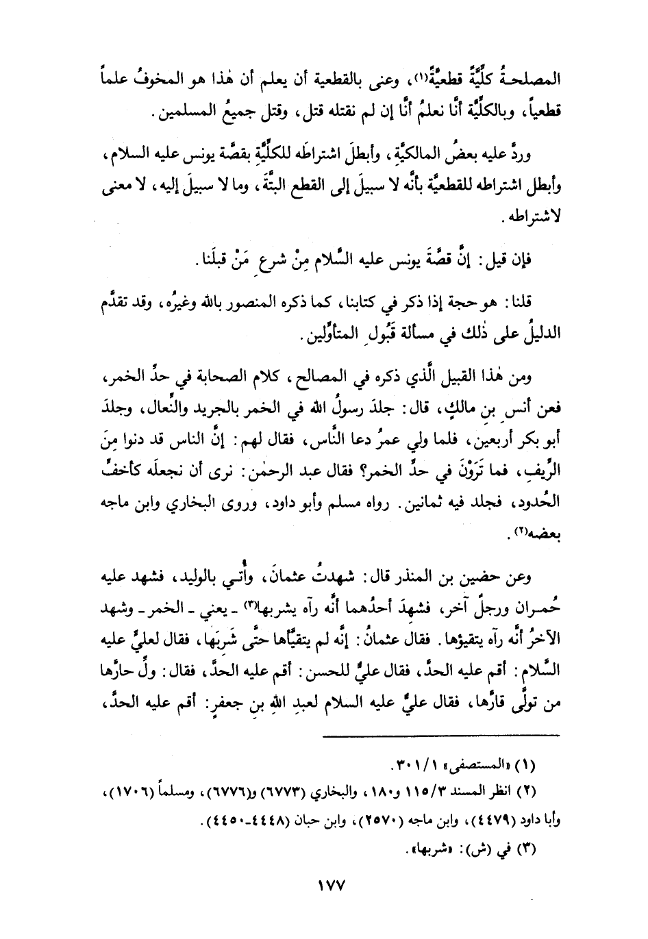 ومن هذا القبيل الذي ذكره في المصالح، كلام الصحابة في حدِّ الخمر، فعن أنس بن مالكٍ، قال: جلد رسول الله في الخمر بالجريد والنعال، وجلد أبو بكر أربعين، فلما ولي عمر دعا الناس، فقال لهم: إن الناس قد دنوا من الريف، فما تَرَوْنَ في حدِّ الخمر؟ فقال عبد الرحمن: نرى أن نجعله كأخفِّ الحدود، فجلد فيه ثمانين. رواه مسلم وأبو داود، وروى البخاري وابن ماجه بعضه (¬2).