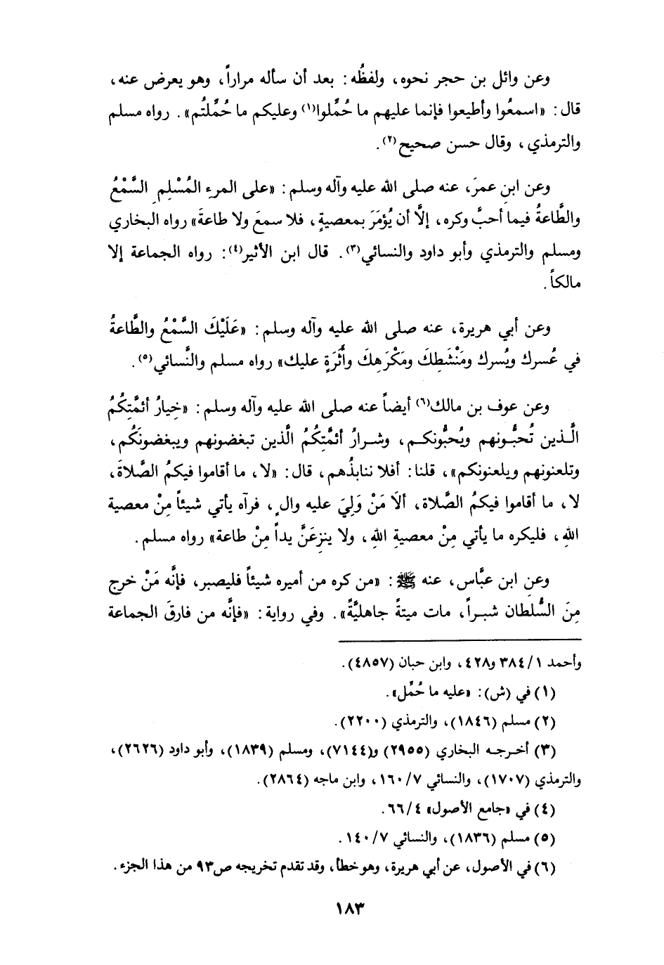 وعن ابن عمر، عنه صلى الله عليه وآله وسلم: " على المرء المُسْلِمِ السمع والطاعة فيما أحبَّ وكره، إلاَّ أن يُؤمَرَ بمعصيةٍ، فلا سمع ولا طاعة " رواه البخاري ومسلم والترمذي وأبو داود والنسائي (¬3). قال ابن الأثير (¬4): رواه الجماعة إلا مالكاً.
