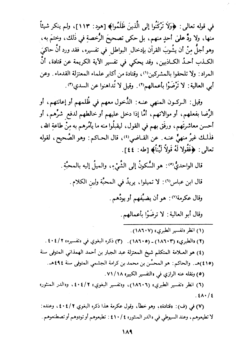 في قوله تعالى: {ولا تَرْكَنُوا إلى الذين ظلموا} [هود: 113]، ولم ينكر شيئاً منها، ولا رد على أحدٍ منهم، بل حكى تصحيح الرخصة في ذلك، وختم به، وهو أجلُّ من أن يشُوبَ القرآن بإدخال البواطل في تفسيره، فقد ورد أن حاكي الكذب أحد الكاذبين، وقد يحكي في تفسير الآية الكريمة عن قتادة، أن المراد: ولا تلحقوا بالمشركين (¬1)، وقتادة من أكابر علماء المعتزلة القدماء. وعن أبي العالية: لا تَرْضَوْا بأعمالهم (¬2). وقيل لا تُداهنوا عن السدي (¬3).