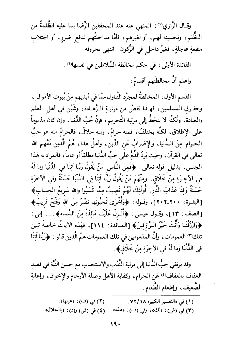 القسم الأول: المخالطة لمجرد التناول مما في أيديهم من بيوت الأموال، وحقوق المسلمين، فهذا نقصٌ من مرتبة الزَّهادة، وشَيْن في أهلِ العلم والعبادة، ولكنه لا ينحَطُّ إلى مرتبة التحريم، فإن حُبَّ الدنيا، وإن كان مذموماً على الإطلاق، لكنه يختلف، فمنه حرامٌ، ومنه حلالٌ، فالحرام منه هو حب الحرام من الدنيا، والإضراب عن الدين، وأهل هذا، هُمُ الذين ذمَّهم الله تعالى قي القرآن، وحيث يَرِدُ الذم على حبِّ الدنيا مطلقاً أو عاماً، فالمراد به هذا الجنس، بدليل قوله تعالى: {فَمِنَ النَّاسِ مَنْ يَقُولُ رَبَّنَا آتِنَا فِي الدُّنْيَا وَمَا لَهُ فِي الْآخِرَةِ مِنْ خَلَاقٍ (200) وَمِنْهُمْ مَنْ يَقُولُ رَبَّنَا آتِنَا فِي الدُّنْيَا حَسَنَةً وَفِي الْآخِرَةِ حَسَنَةً وَقِنَا عَذَابَ النَّارِ (201) أُولَئِكَ لَهُمْ نَصِيبٌ مِمَّا كَسَبُوا وَاللَّهُ سَرِيعُ الْحِسَابِ} [البقرة: 200 - 202]، وقوله: {وَأُخْرَى تُحِبُّونَهَا نَصْرٌ مِنَ اللَّهِ وَفَتْحٌ قَرِيبٌ} [الصف: 13]، وقول عيسى: {أَنْزِلْ عَلَيْنَا مَائِدَةً مِنَ السَّمَاءِ} ... إلى: {وَارْزُقْنَا وَأَنْتَ خَيْرُ الرَّازِقِين} [المائدة: 114]، فهذه الآيات خاصة تبين تلك (¬3) العمومات، وأن المذمومين في تلك العمومات هم الذين قالوا: {رَبَّنَا آتِنَا فِي الدُّنْيَا وَمَا لَهُ فِي الْآخِرَةِ مِنْ خَلَاقٍ}.