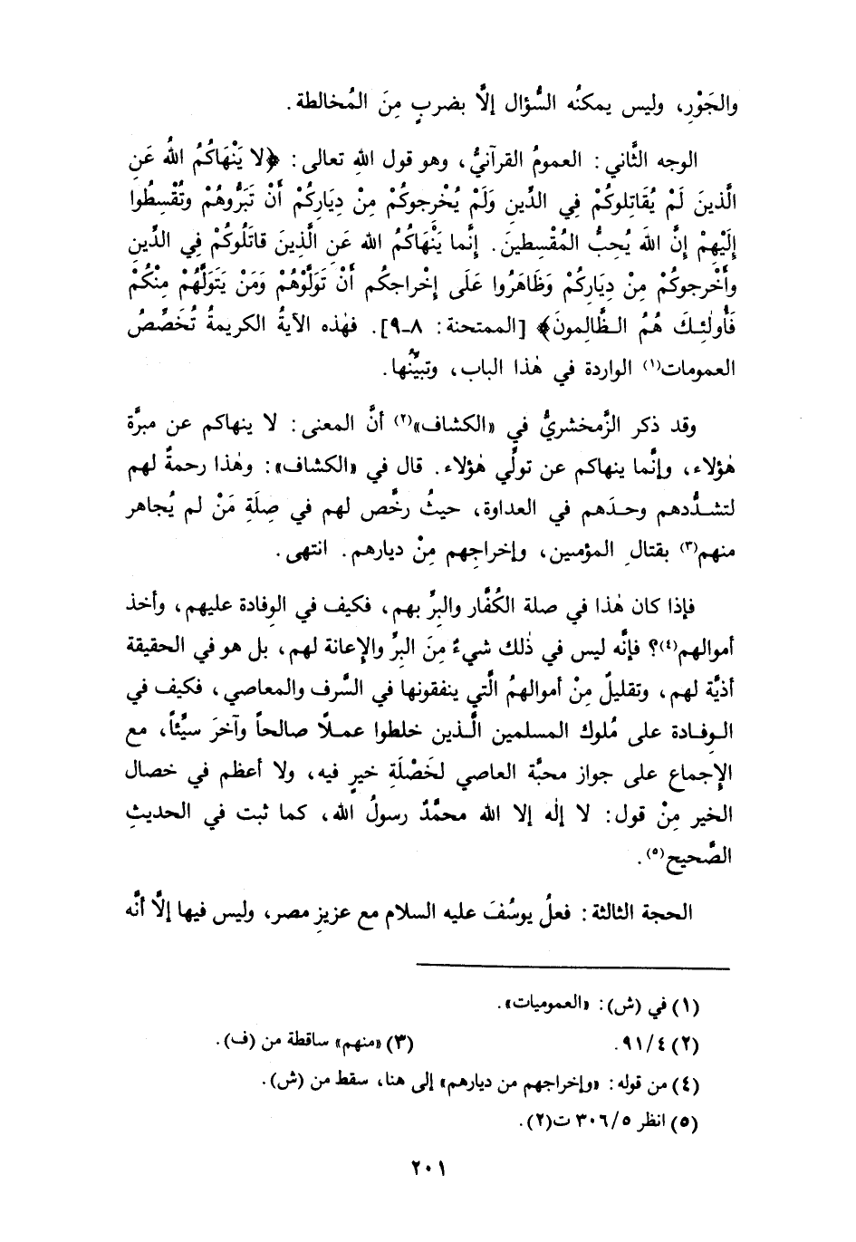 الوجه الثاني: العموم القرآني، وهو قول الله تعالى: {لَا يَنْهَاكُمُ اللَّهُ عَنِ الَّذِينَ لَمْ يُقَاتِلُوكُمْ فِي الدِّينِ وَلَمْ يُخْرِجُوكُمْ مِنْ دِيَارِكُمْ أَنْ تَبَرُّوهُمْ وَتُقْسِطُوا إِلَيْهِمْ إِنَّ اللَّهَ يُحِبُّ الْمُقْسِطِينَ (8) إِنَّمَا يَنْهَاكُمُ اللَّهُ عَنِ الَّذِينَ قَاتَلُوكُمْ فِي الدِّينِ وَأَخْرَجُوكُمْ مِنْ دِيَارِكُمْ وَظَاهَرُوا عَلَى إِخْرَاجِكُمْ أَنْ تَوَلَّوْهُمْ وَمَنْ يَتَوَلَّهُمْ فَأُولَئِكَ هُمُ الظَّالِمُون} [الممتحنة: 8 - 9]. فهذه الآية الكريمة تُخَصِّصُ العمومات (¬1) الواردة في هذا الباب، وتبيِّنُها.